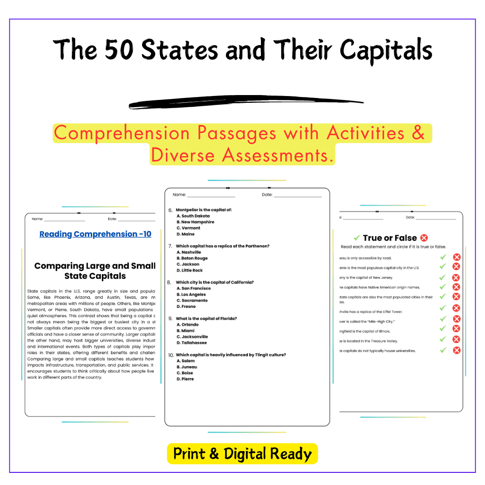 This worksheet helps your students master U.S. geography with this interactiveย The 50 States and Their Capitalsย worksheet! Designed for grades 4โ8, this resource introduces all 50 U.S. states, their capitals, and fun geographic facts to make memorization easy and enjoyable.