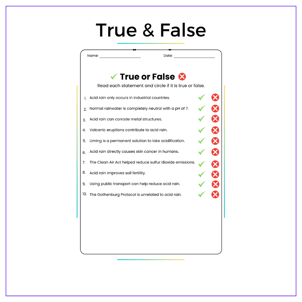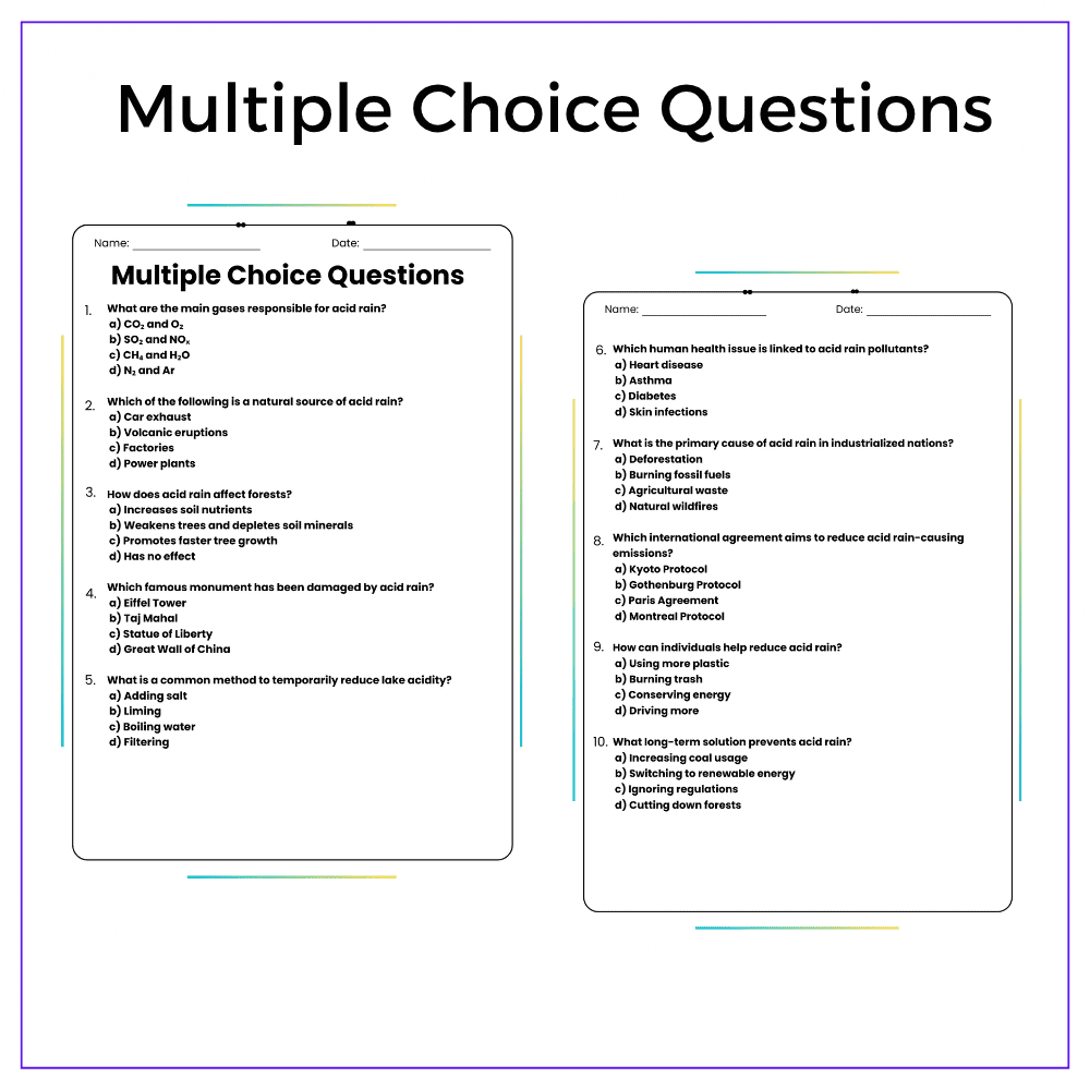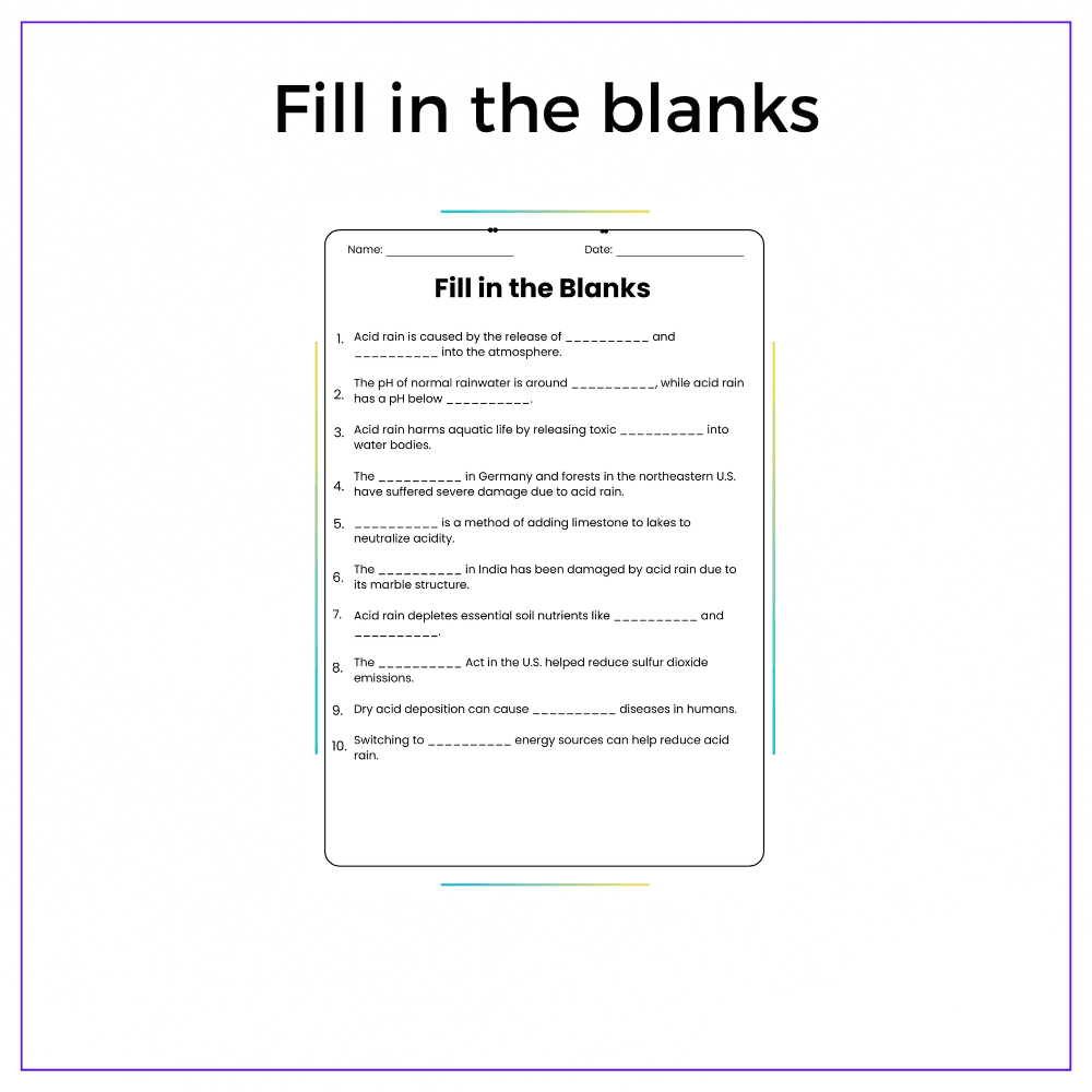 This worksheet helps your students explore environmental science with this interactive Acid Rain worksheet! Designed for grades 4–8, this resource dives into what acid rain is, how it forms, and the damage it can cause to plants, animals, buildings, and ecosystems.