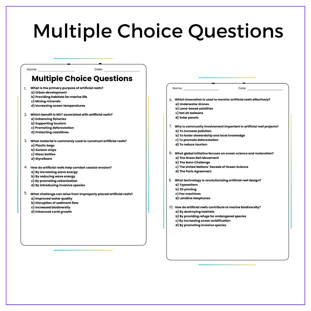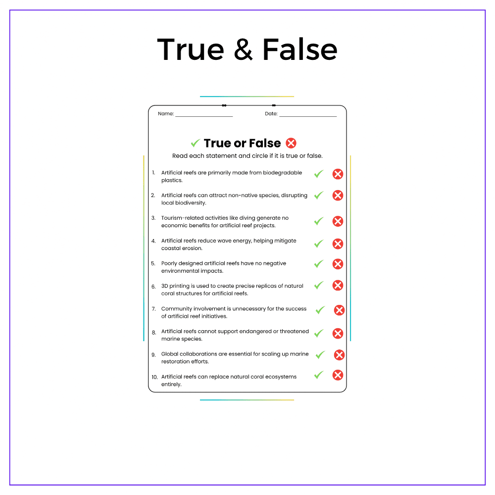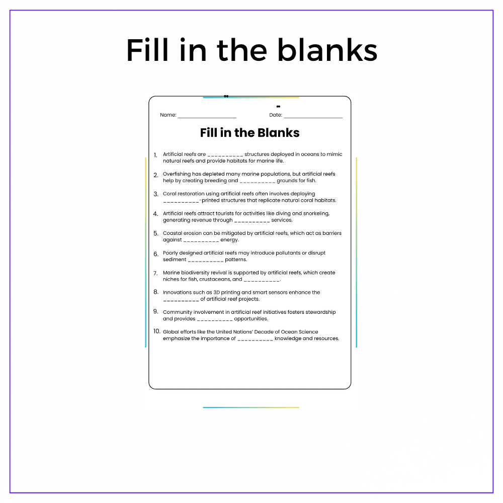 This worksheet helps your students dive into ocean recovery with this interactive Restoration of Marine Ecosystems Using Artificial Reefs worksheet! Designed for grades 4–8, this resource explores how human-made structures like artificial reefs help marine species thrive, restore habitats, and support biodiversity.