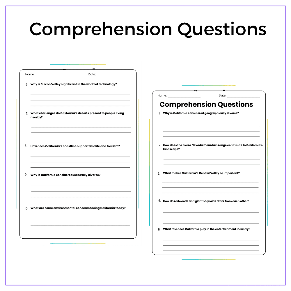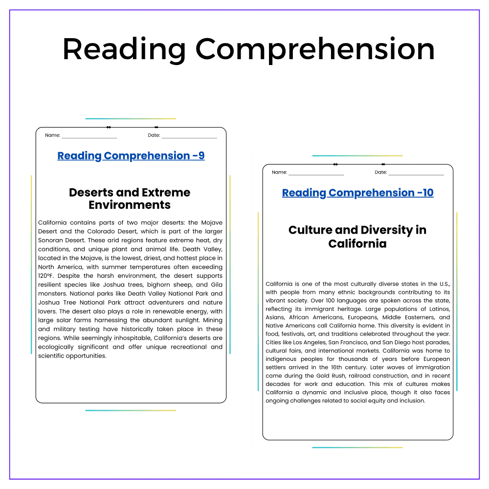 This versatile worksheet is perfect for individual assignments, group discussions, homeschooling, or extra practice, helping students discover California’s unique geography and cultural significance. With engaging passages, map activities, fill-in-the-blanks, MCQs, and creative thinking questions, students will gain a well-rounded understanding of the Golden State.