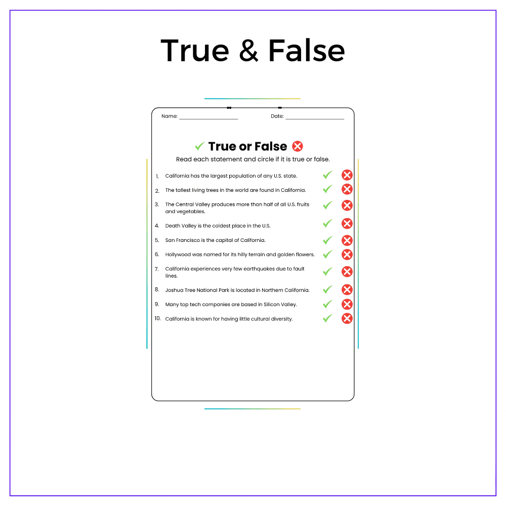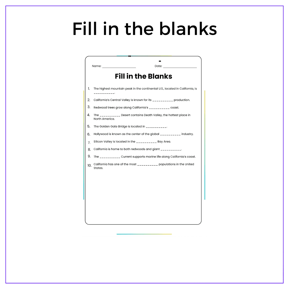 This worksheet helps your students explore the dynamic state of California with this interactive California: Geography, Landmarks, and Facts worksheet! Designed for grades 4–8, this resource dives into California’s mountains, coastlines, national parks, and world-famous landmarks like the Golden Gate Bridge and Hollywood.