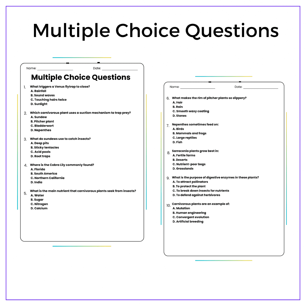 Help your students uncover the fascinating world of meat-eating plants with this engaging Carnivorous Plants worksheet! Designed for grades 4–8, this resource explores how plants like Venus flytraps, pitcher plants, and sundews capture insects and gain nutrients. Students will connect biology, ecology, and environmental science in one exciting lesson. This versatile worksheet is perfect for individual assignments, group discussions, homeschooling, or extra practice—encouraging curiosity, critical thinking, and a love for plant science.