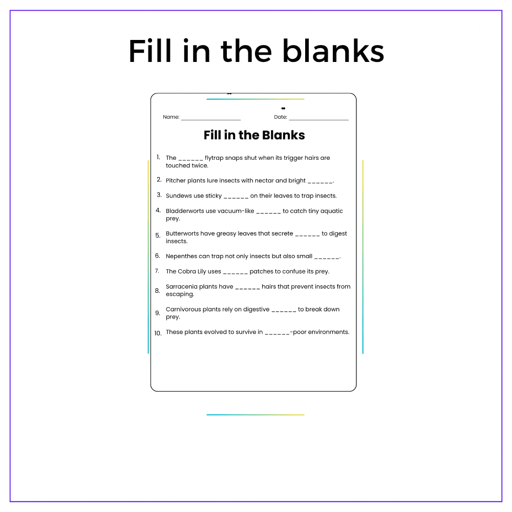 ✅ Fill-in-the-blanks – Reinforce key terms like photosynthesis, enzymes, nectar, and prey