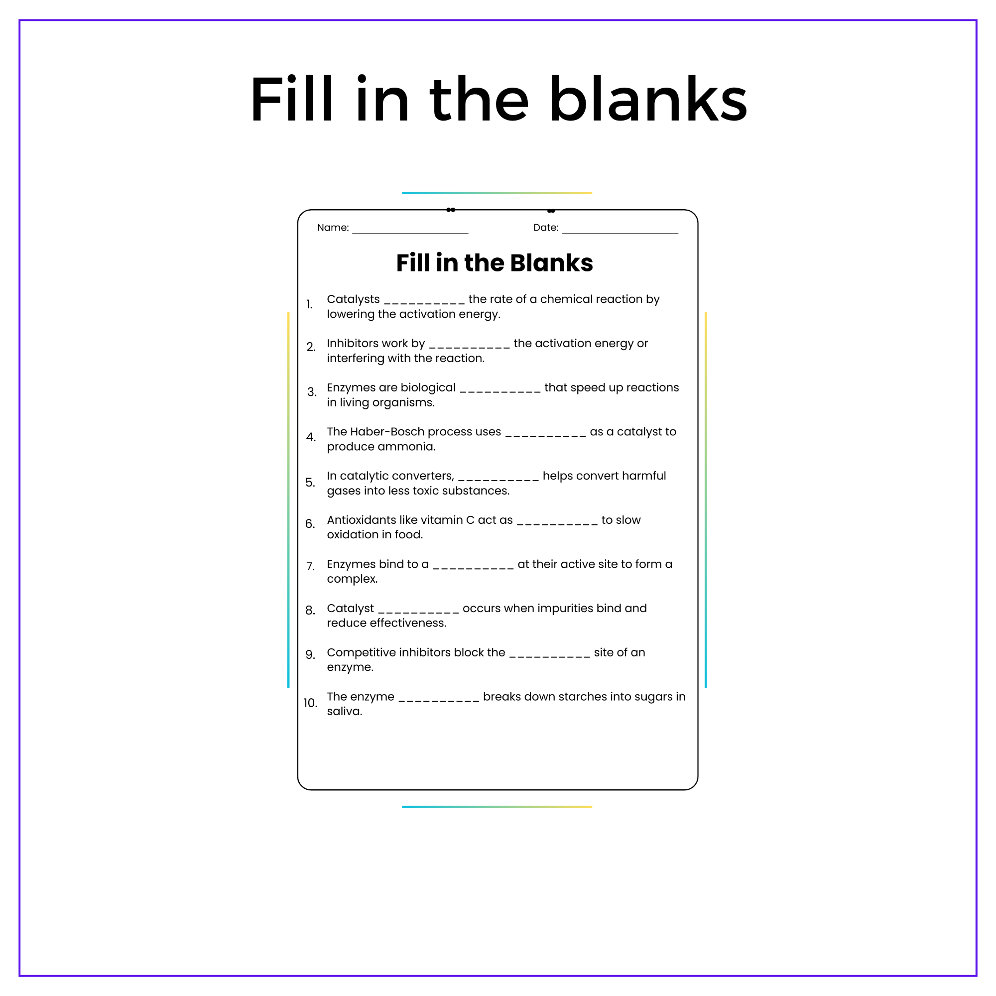 • Fill-in-the-Blanks – Learn terminology like enzyme, activation energy, and reaction rate