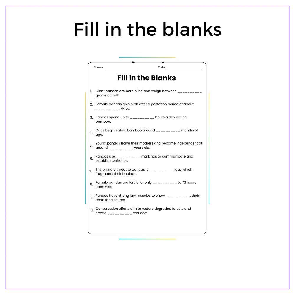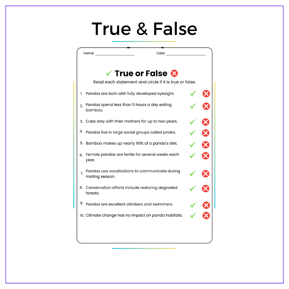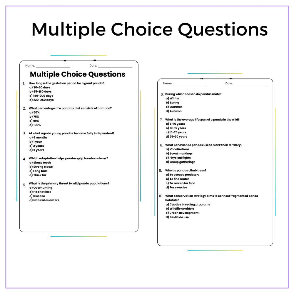 This versatile worksheet is perfect for individual assignments, group discussions, homeschooling, or extra practice, ensuring that every student gains a solid grasp of how pandas develop and survive in their natural habitats. With a mix of comprehension passages, fill-in-the-blanks, multiple-choice questions (MCQs), true/false exercises, and problem-solving challenges, students will stay actively engaged while reinforcing key concepts. The included class activities spark curiosity and encourage collaborative learning.