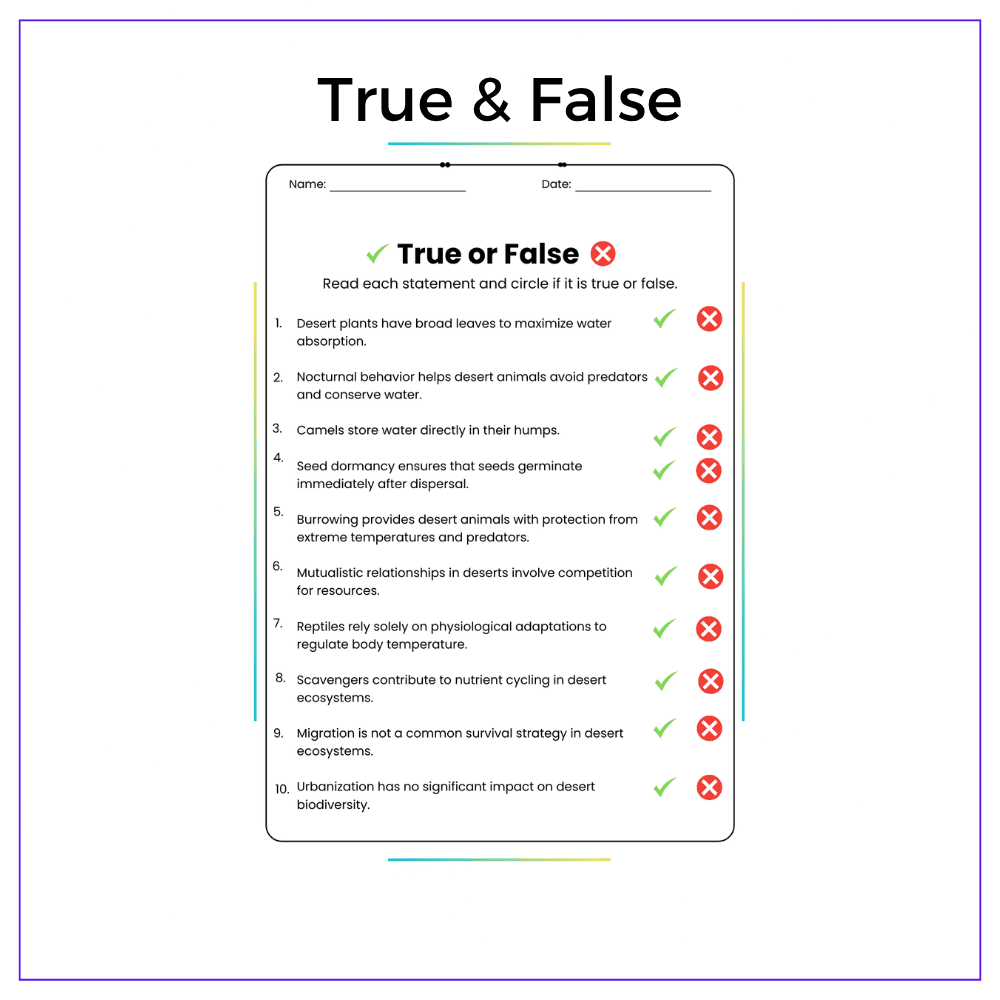 This worksheet helps your students uncover the incredible ways plants and animals survive in harsh desert environments with this interactive Survival Strategies in Desert Ecosystems resource! Designed for grades 4–8, this resource explains how living organisms adapt to extreme heat, dryness, and limited water through engaging activities.
