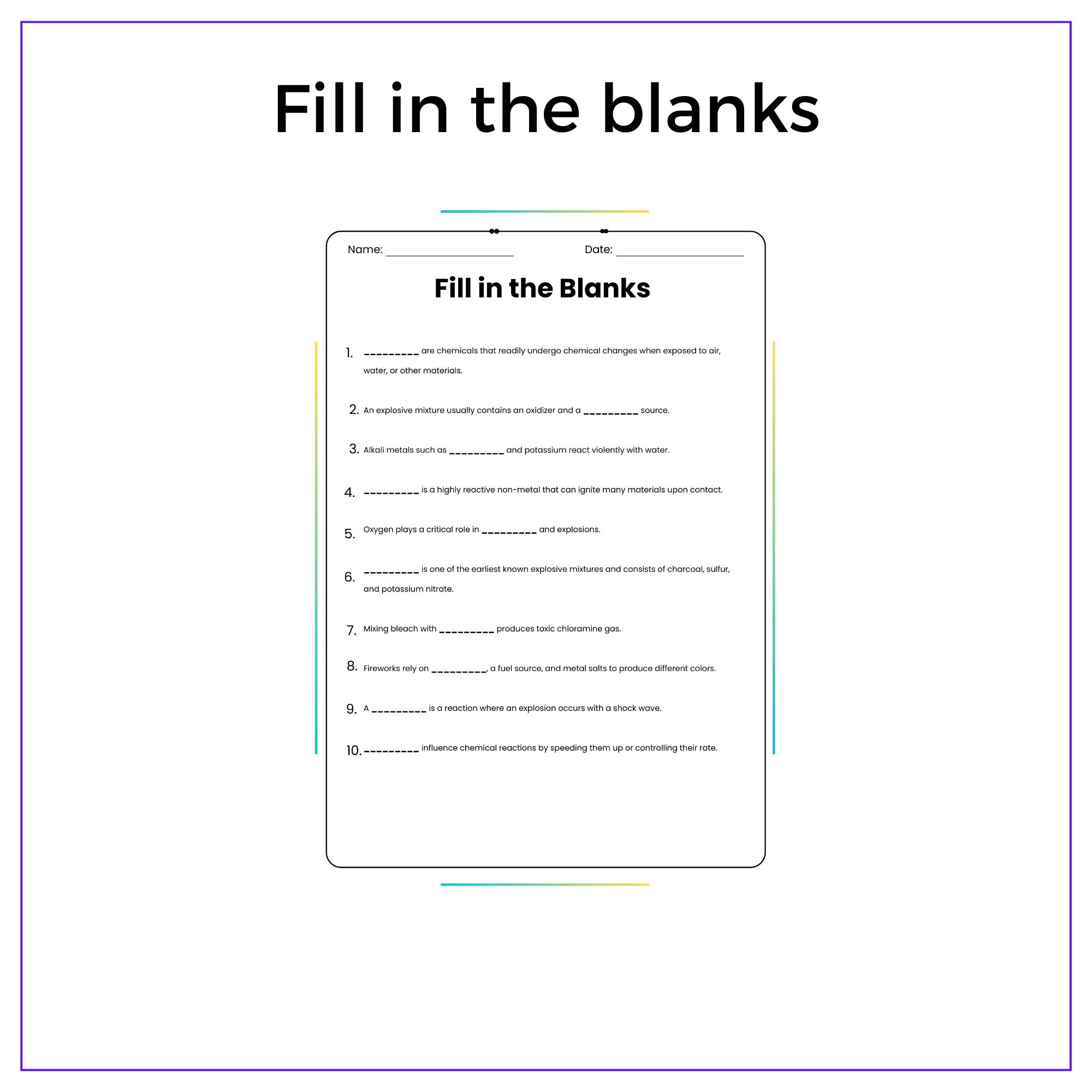 This worksheet helps your students understand the powerful science behind chemical reactivity with this interactive Reactive Substances and Explosive Mixtures worksheet! Designed for grades 4-8, this resource explains why some substances react explosively and how scientists control these reactions in real life.