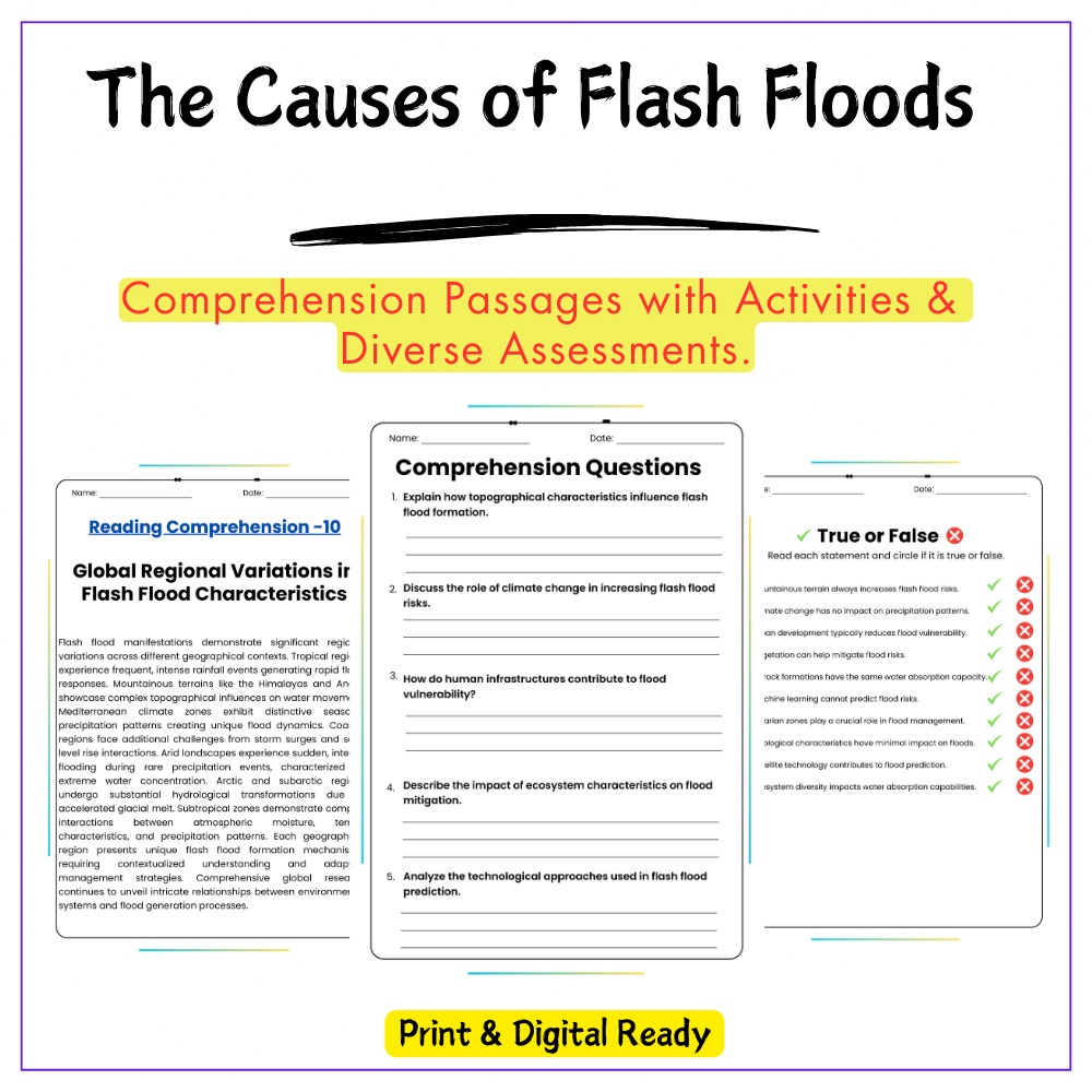 Perfect for water cycle units, disaster studies, or enrichment work, this resource blends Earth science and environmental awareness. With engaging passages, fill-in-the-blanks, multiple-choice questions (MCQs), true/false checks, and problem-solving prompts, students learn how and why flash floods happen—and how to prepare.