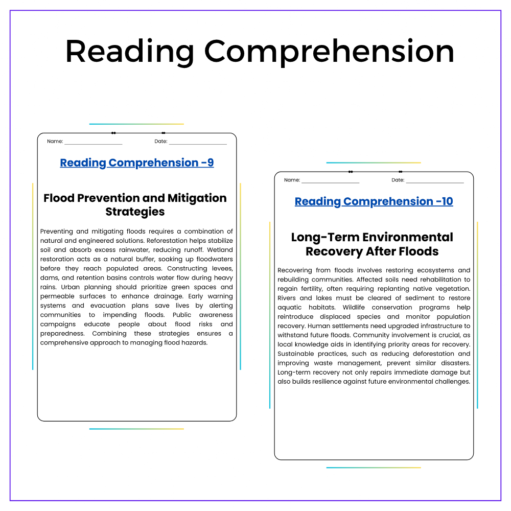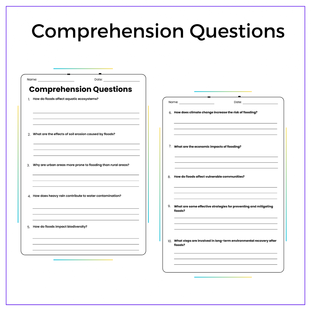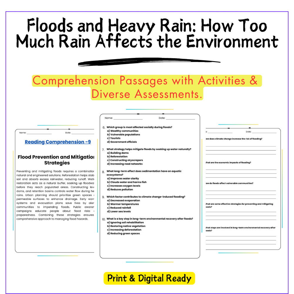 - Comprehension passages – Clear explanations of how floods and heavy rain affect the environment
