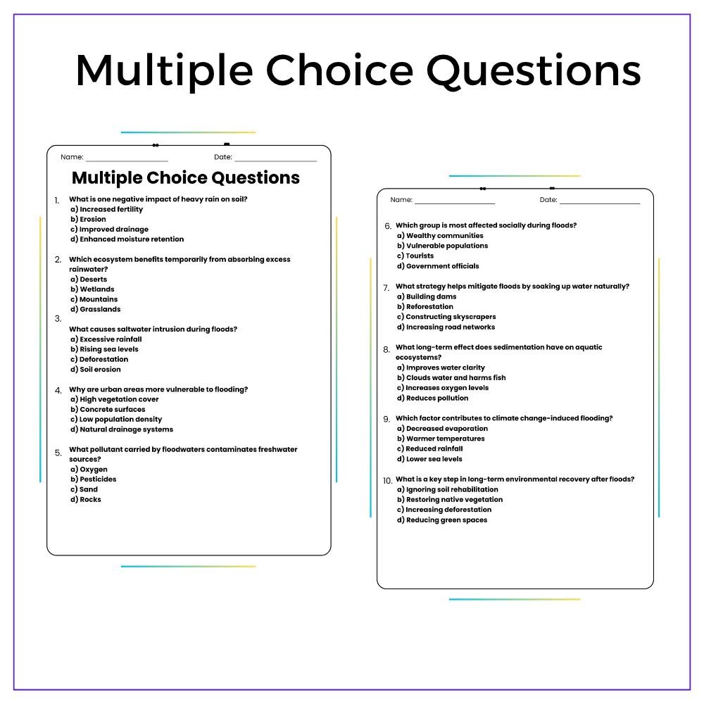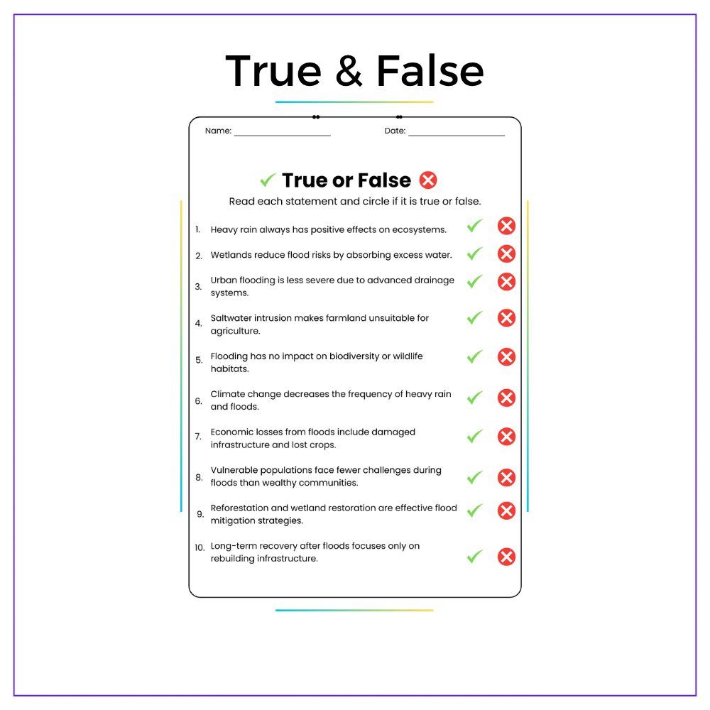 This versatile worksheet is perfect for individual assignments, group projects, homeschooling, or extra review. Students will gain a solid understanding of flooding and its effects through comprehension passages, fill-in-the-blanks, MCQs, true/false challenges, and hands-on activities. Class activities encourage teamwork and real-world connections.