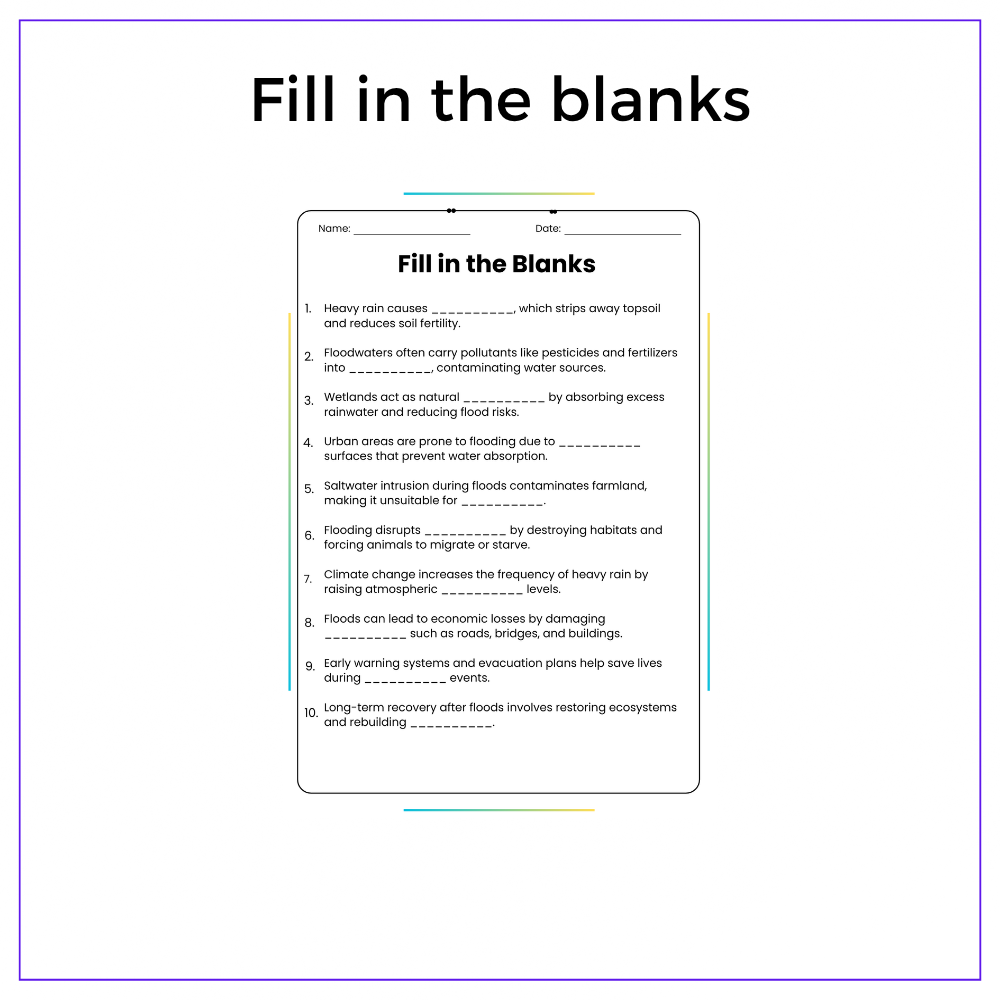 This worksheet helps your students dive into the environmental impacts of extreme rainfall with this interactive Floods and Heavy Rain worksheet! Designed for grades 4–8, this resource explores how too much rain can cause floods and affect soil, plants, animals, and communities, using easy-to-understand language and fun exercises.