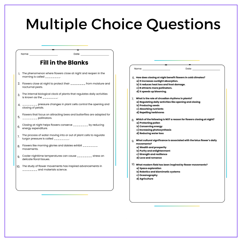This versatile worksheet is perfect for individual assignments, group discussions, homeschooling, or extra practice, ensuring every student gains a solid grasp of plant rhythms. With comprehension passages, fill-in-the-blanks, multiple-choice questions (MCQs), true/false exercises, and problem-solving challenges, students stay actively engaged while reinforcing key concepts. The included class activities spark curiosity and encourage collaborative learning.