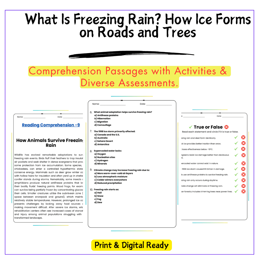 This worksheet helps your students explore icy weather conditions with this interactive Freezing Rain worksheet! Designed for grades 4–8, this resource explains how freezing rain forms, how it differs from snow and sleet, and why it creates dangerous conditions on roads, trees, and power lines.