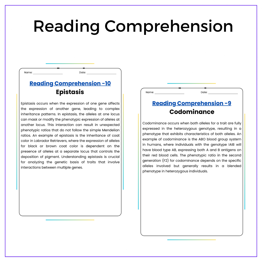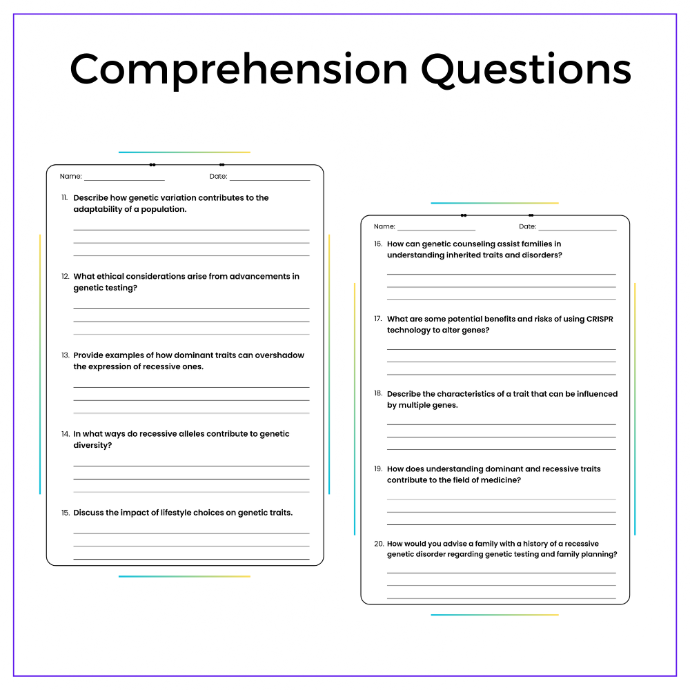 - Comprehension passages – Explain genes, alleles, and inheritance patterns