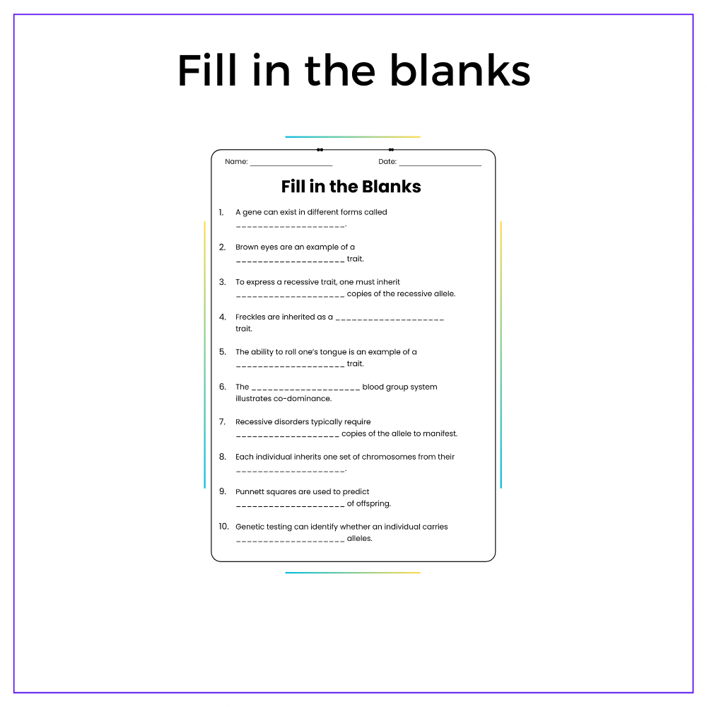 - Fill-in-the-blanks – Key terms like genotype, phenotype, homozygous, heterozygous