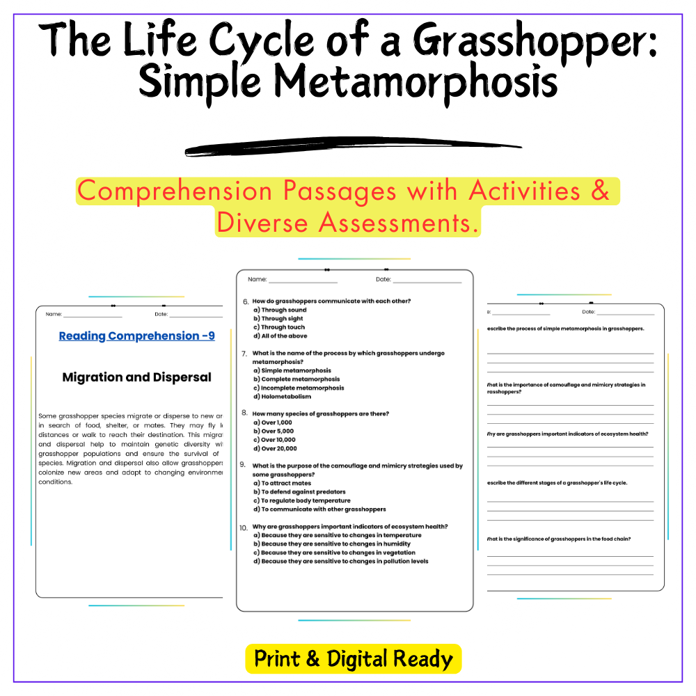 • Comprehension passages – Clear explanations of each stage in a grasshopper’s life