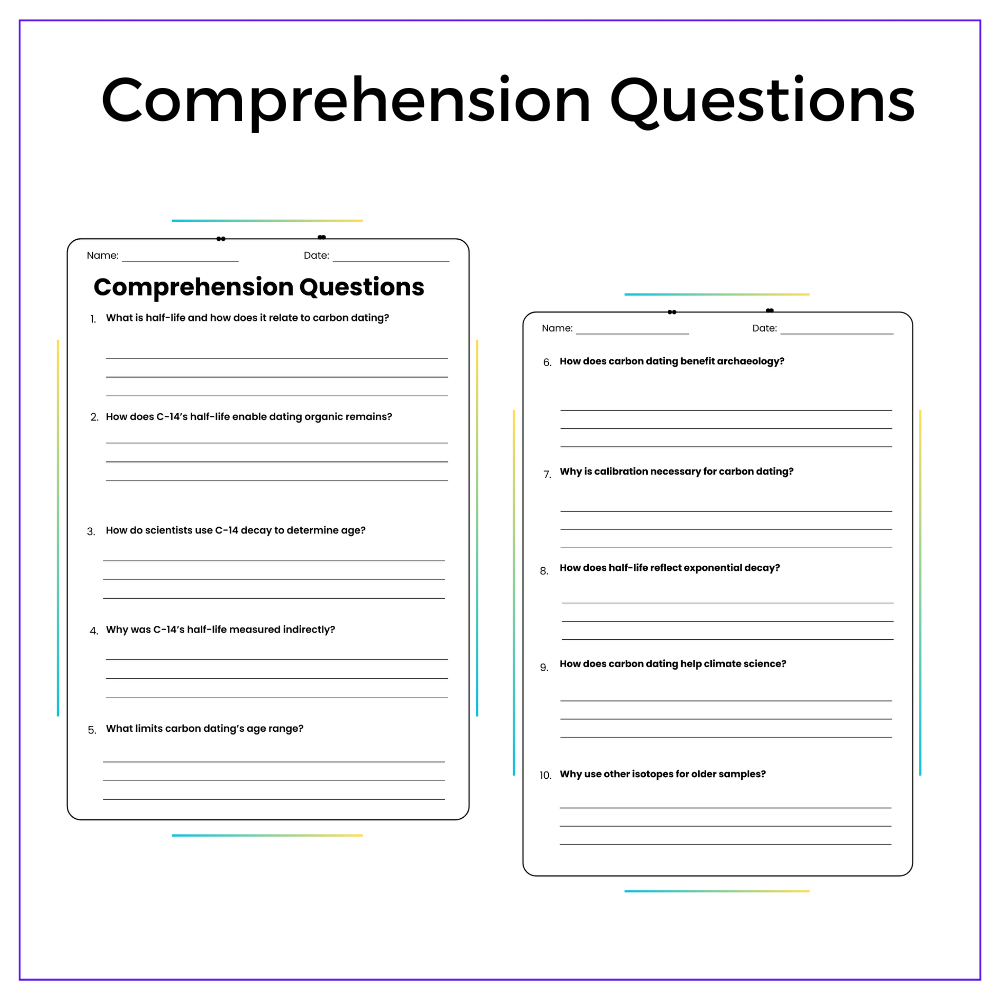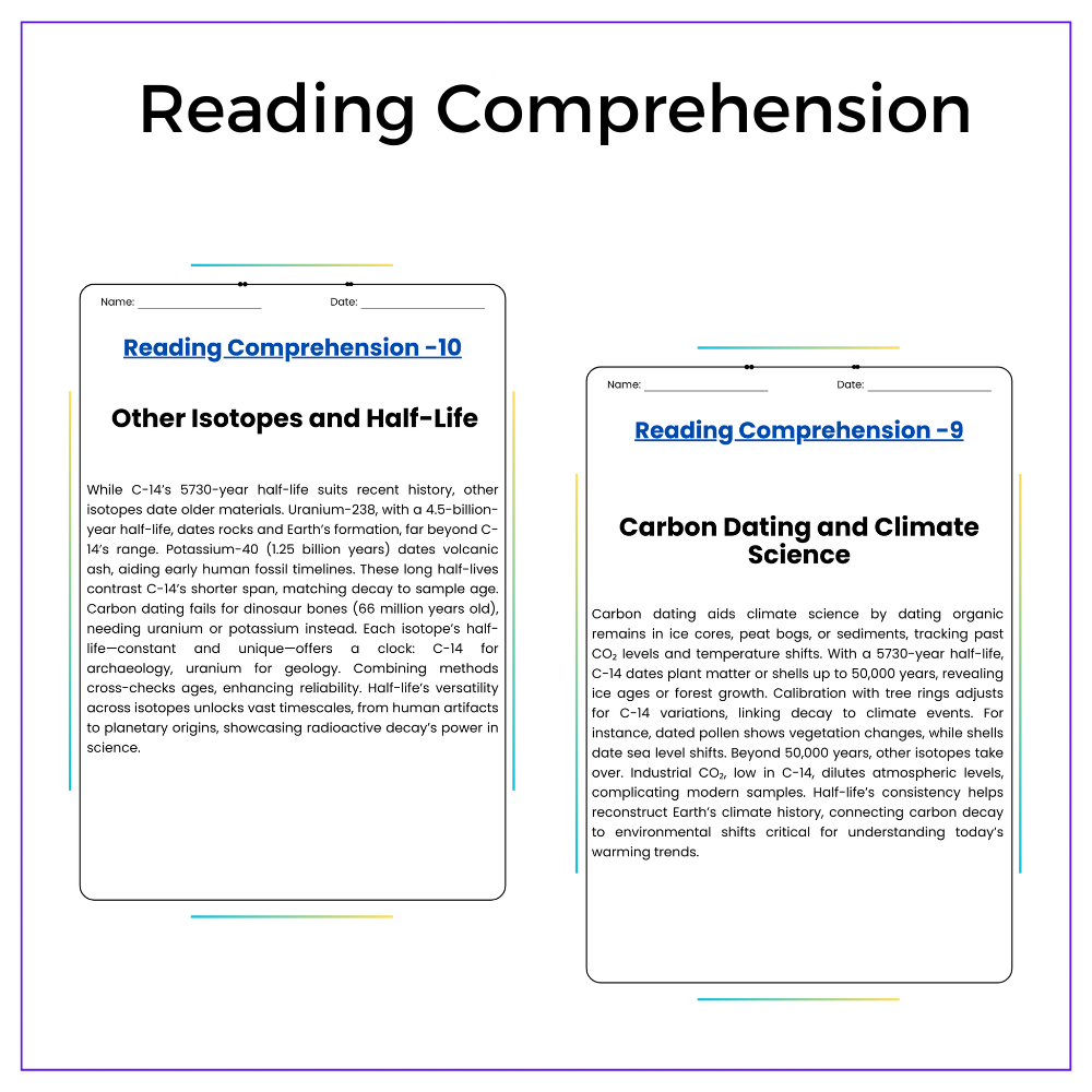 • Comprehension passages – Explain half-life and radiocarbon dating