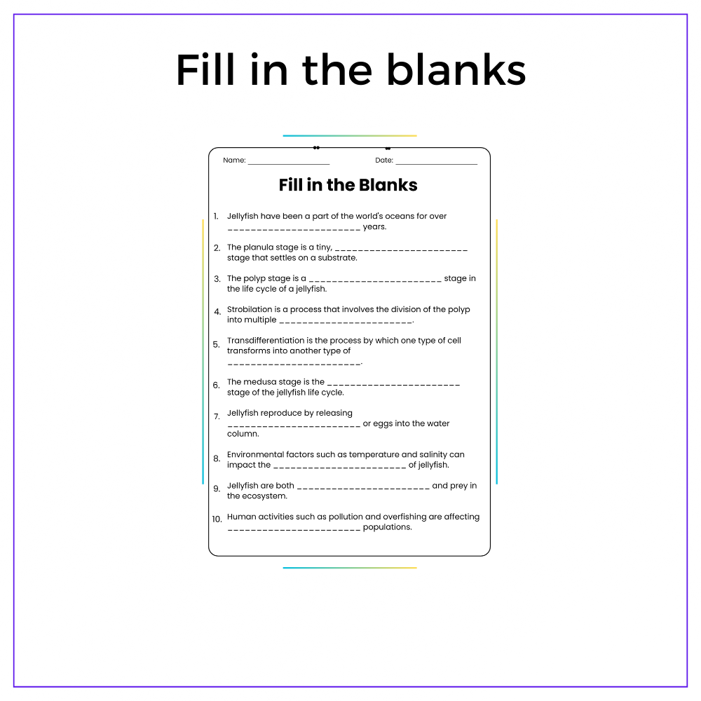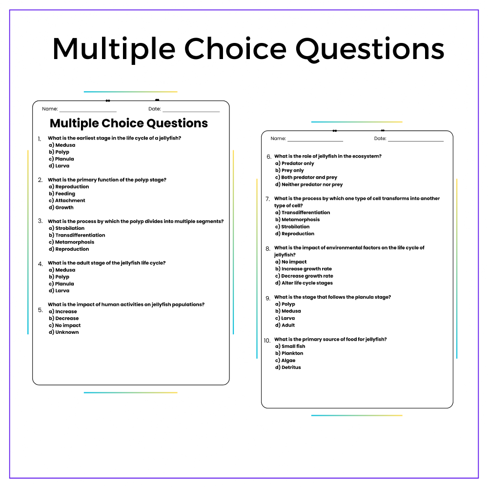 Dive into the amazing underwater journey of jellyfish with this Life Cycle of a Jellyfish worksheet! Perfect for grades 4–8, this resource unpacks the stages of jellyfish development, from tiny polyps to majestic swimmers, through fun and accessible activities.
