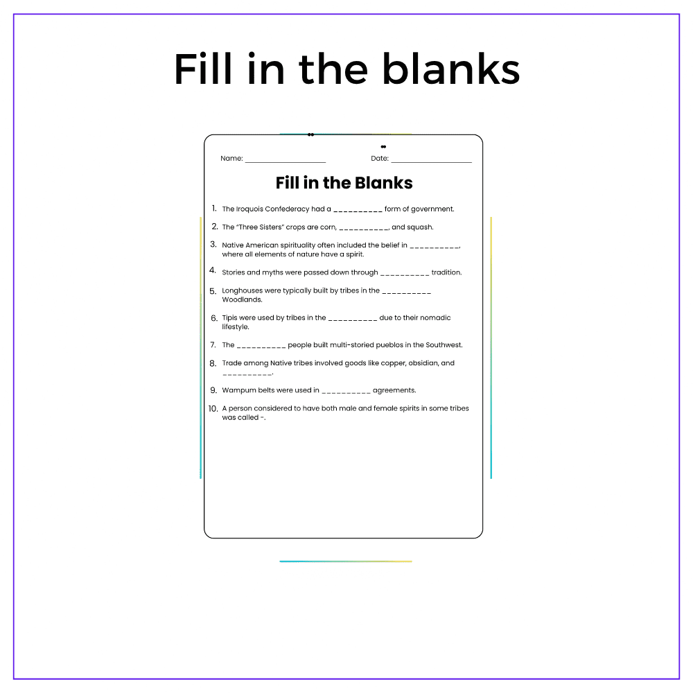 - Fill-in-the-blanks – Practice vocabulary related to native traditions and environments