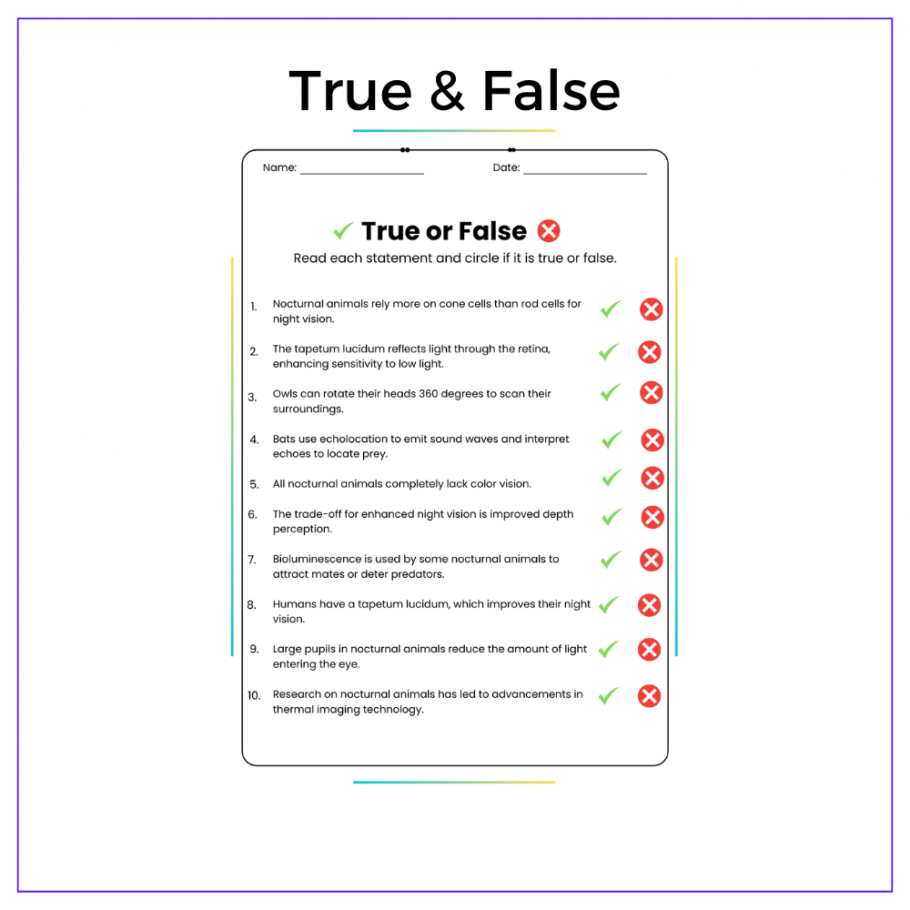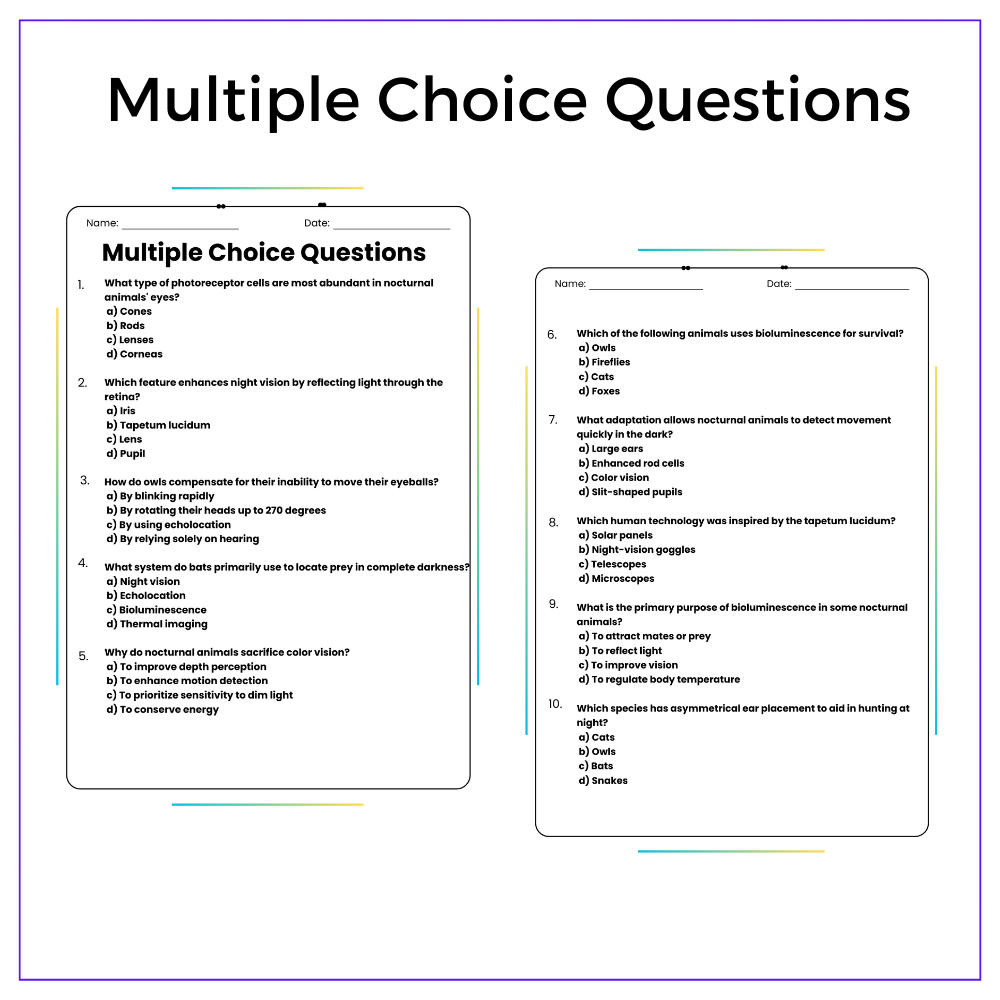 This versatile worksheet is perfect for individual assignments, group discussions, homeschooling, or extra practice, giving students a clear look at biological adaptations. With a blend of comprehension passages, fill-in-the-blanks, multiple-choice questions (MCQs), true/false exercises, and problem-solving challenges, learners develop a thorough understanding of nocturnal vision. Engaging class activities make learning both fun and meaningful.