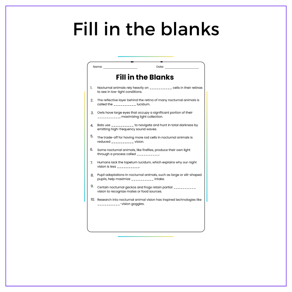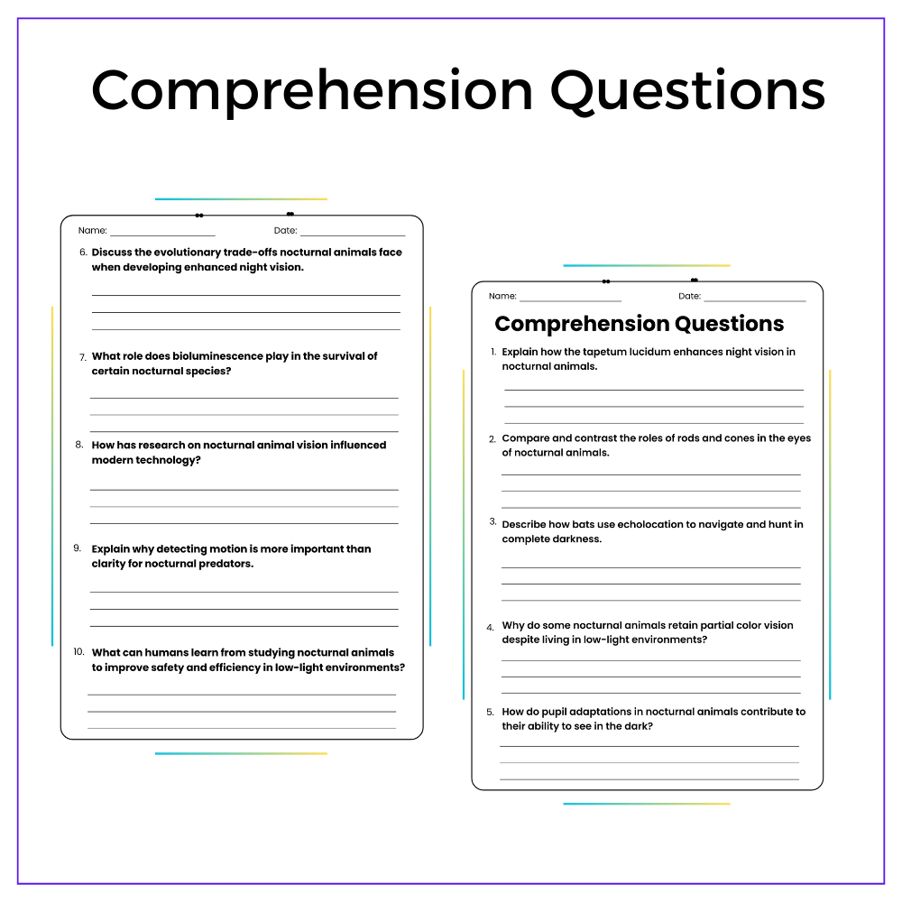 This worksheet helps your students uncover the secrets of night vision in the animal kingdom with this interactive How Nocturnal Animals See in the Dark resource! Designed for grades 4–8, this lesson explains how creatures like owls, cats, and bats adapt their eyes for low-light environments.