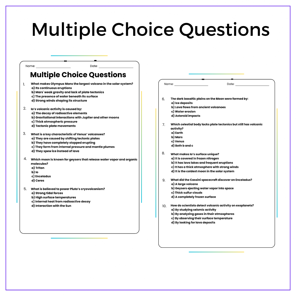 This versatile worksheet is perfect for individual assignments, group projects, homeschooling, or science enrichment, ensuring that every learner grasps how volcanoes shape other worlds. With a blend of reading passages, fill-in-the-blanks, MCQs, true/false questions, and analytical tasks, students stay involved while uncovering fascinating planetary science. The included class activities fuel creativity and scientific curiosity.