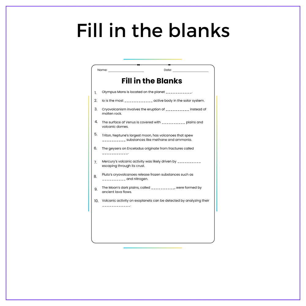 This worksheet takes your students on a thrilling journey beyond Earth with this interactive Volcanic Activity on Other Planets worksheet! Designed for grades 4–8, this resource explores active and extinct volcanoes on celestial bodies like Mars, Venus, and Jupiter’s moon Io, helping students compare planetary geology in an engaging and easy-to-understand way.