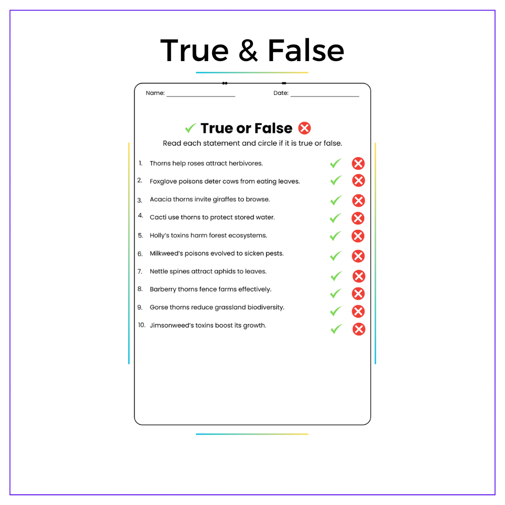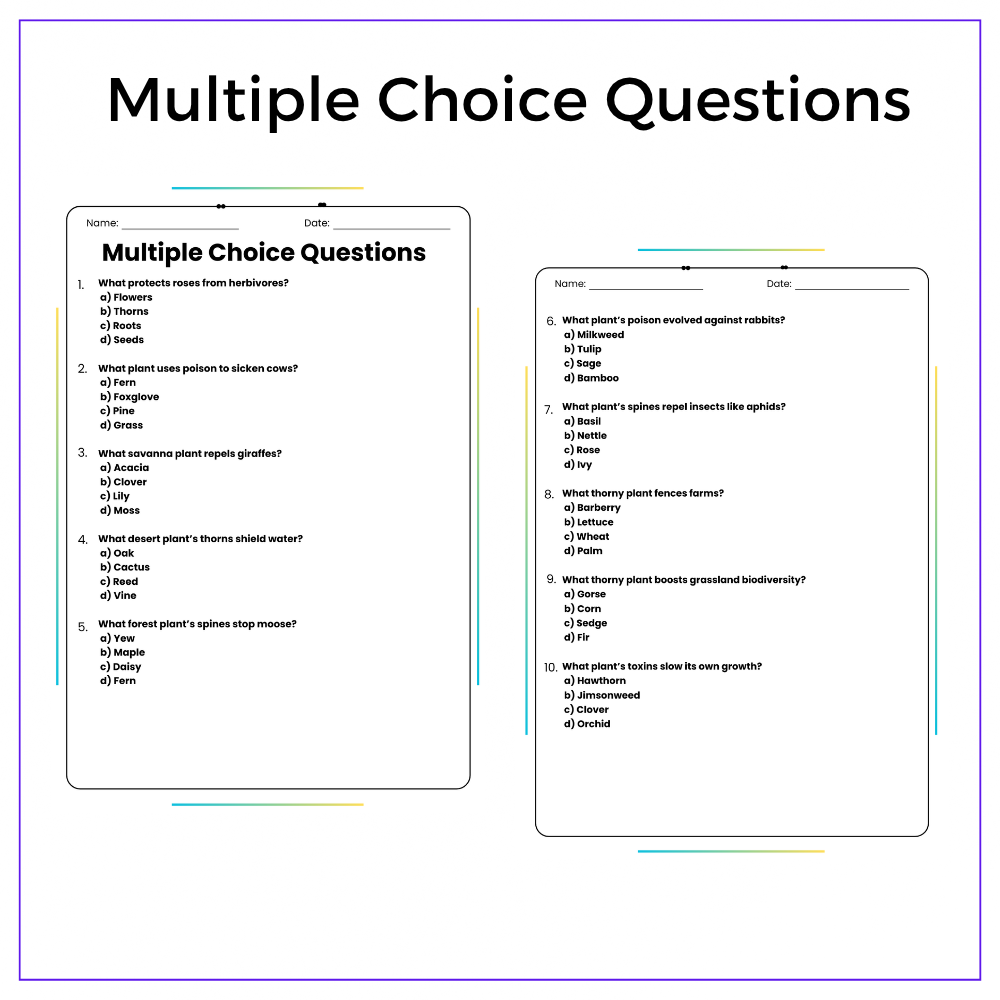 This worksheet helps your students uncover how plants protect themselves with this interactive Defense Mechanisms in Plants: Thorns and Poisons worksheet! Designed for grades 4–8, this resource explores how different species ward off herbivores using sharp structures and chemical defenses.