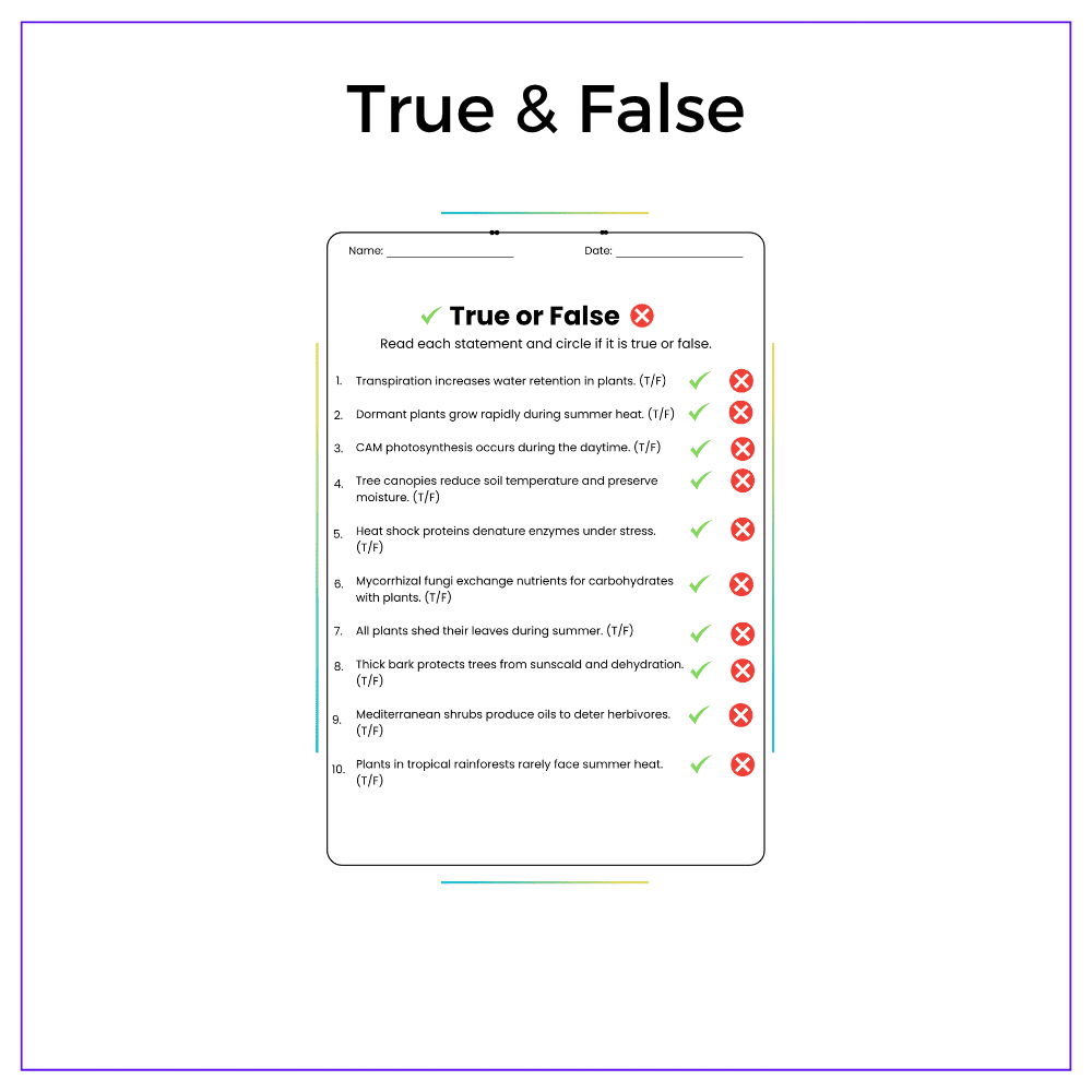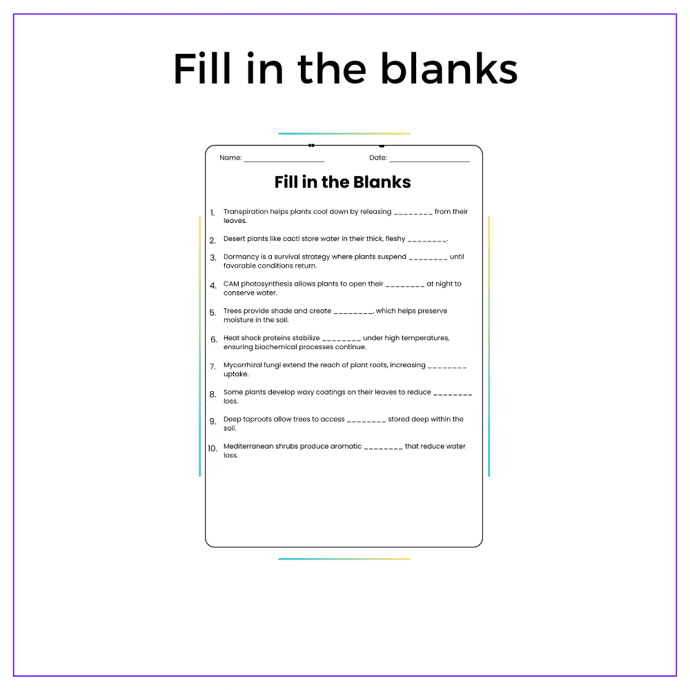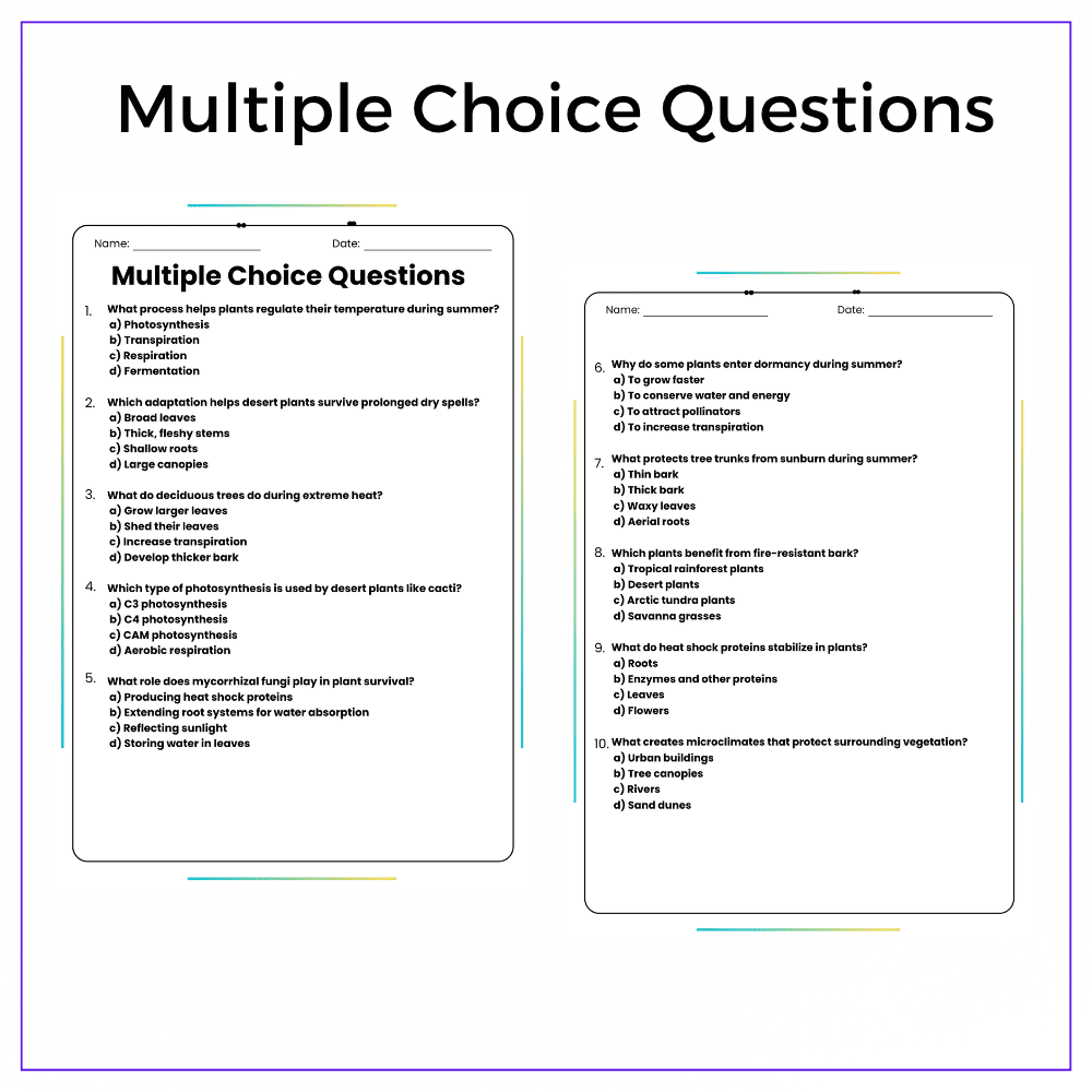 This worksheet helps your students learn plant biology in action with this interactive How Plants and Trees Survive Summer Heat worksheet! Designed for grades 4–8, this resource explains how leaves, roots, and plant behavior adapt to hot weather using real-life examples.