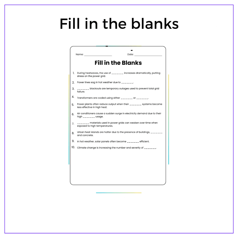 ✅ Fill-in-the-blanks – Reinforce key terms like electricity demand, outage, transformer, and energy efficiency