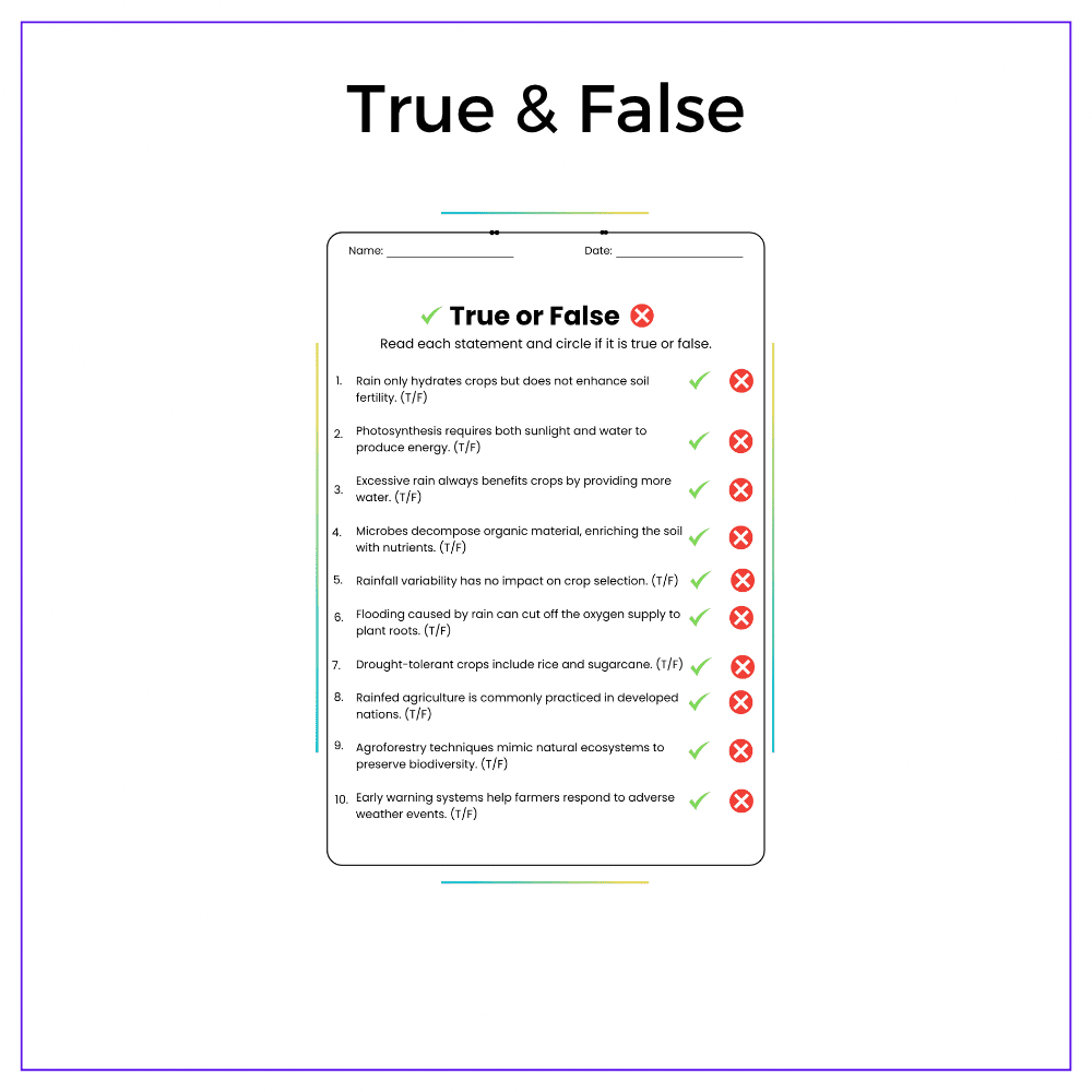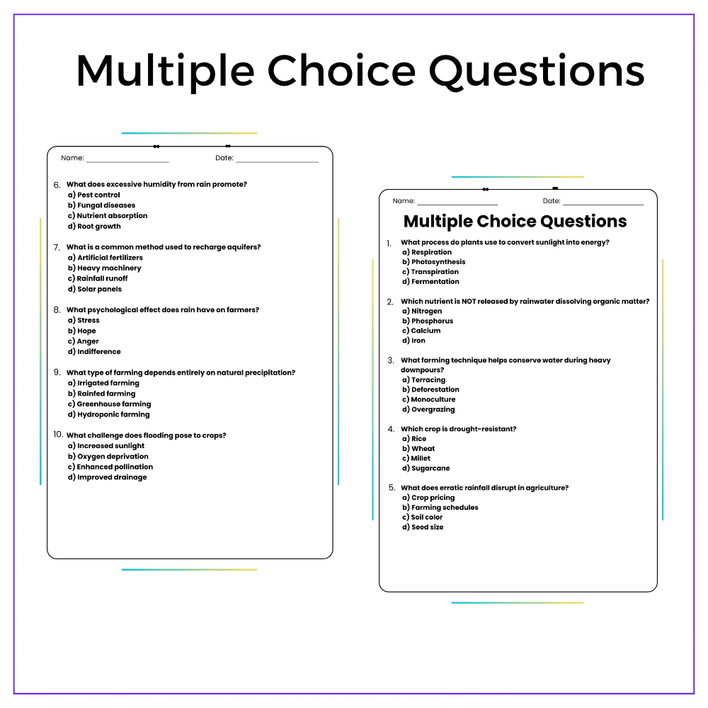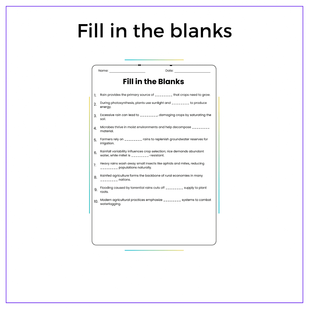 This versatile worksheet is perfect for individual assignments, group discussions, homeschooling, or extra practice, showing students the essential role of rain in farming. Through informative passages, fill-in-the-blanks, MCQs, true/false exercises, and critical thinking tasks, students will learn how farmers depend on rain to feed the world.
