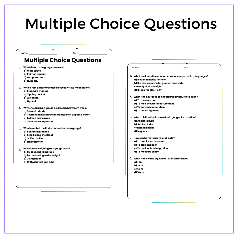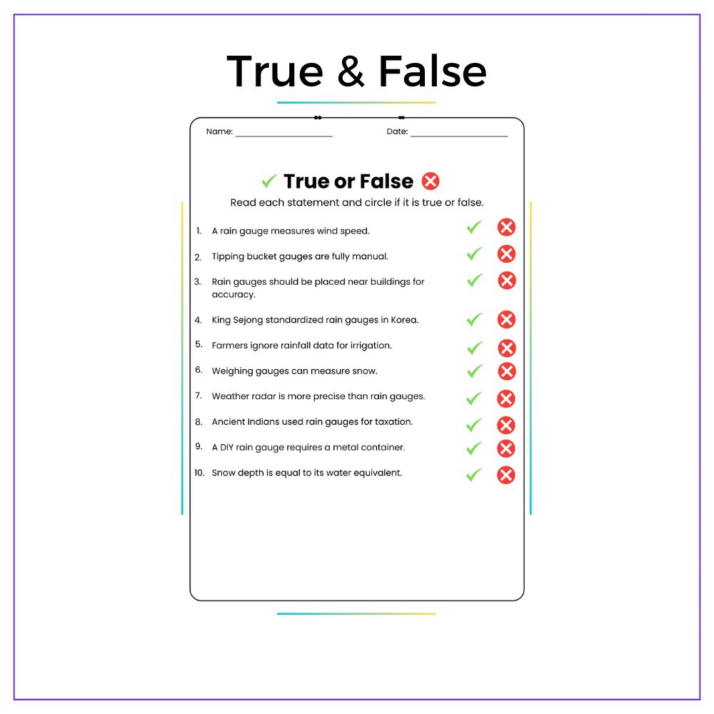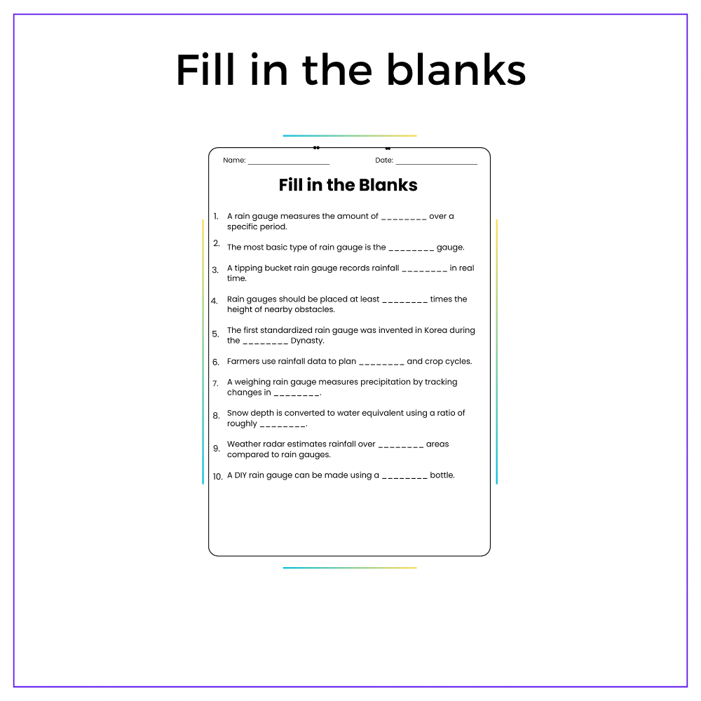 Perfect for individual or group learning, this resource blends scientific concepts with hands-on learning. With engaging passages, fill-in-the-blanks, MCQs, true/false activities, and creative challenges, students gain a solid understanding of how we measure rain. Classroom exercises foster real-world connections and collaboration.