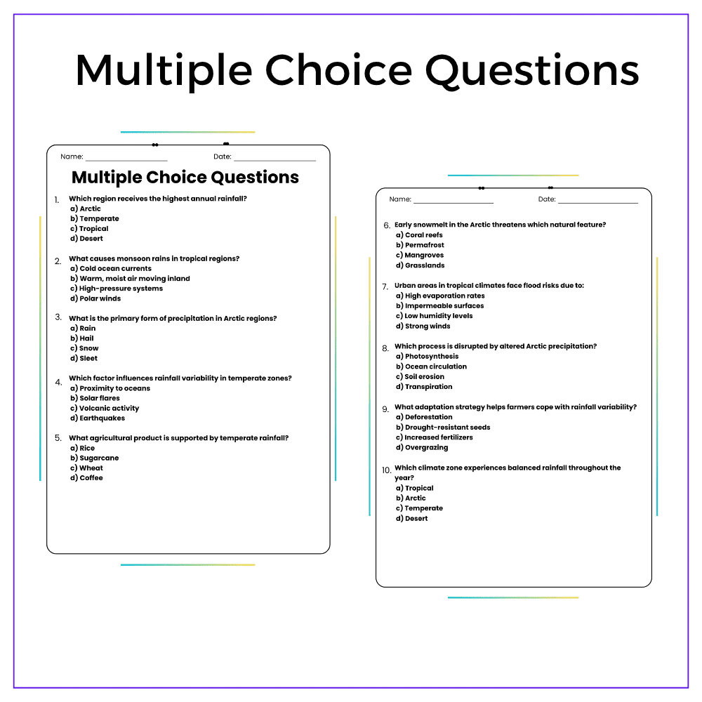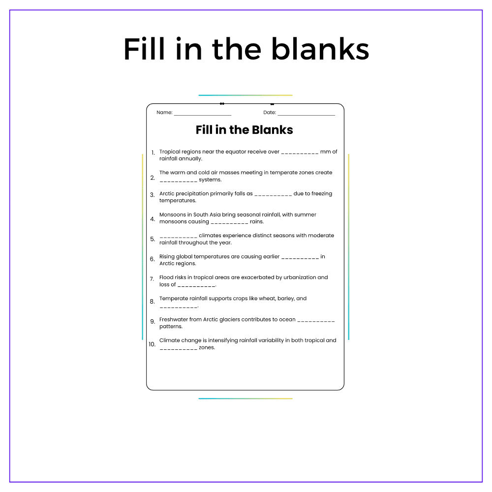 This worksheet helps your students explore global weather with this interactive Rain in Different Climates worksheet! Designed for grades 4–8, this resource explains how and why rainfall patterns vary in tropical, temperate, and arctic regions, encouraging students to compare weather across the globe.