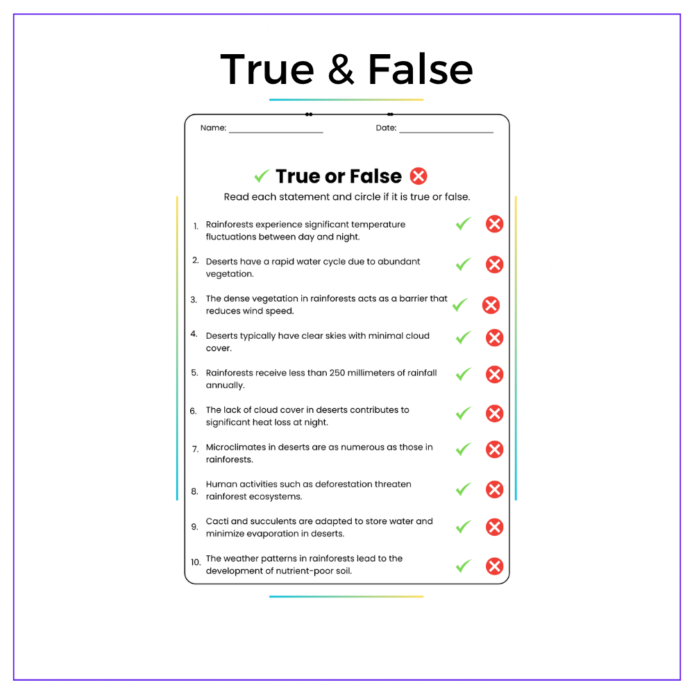 This worksheet helps your students investigate the striking weather differences between rainforests and deserts with this interactive Comparing Weather in a Rainforest vs. a Desert resource! Designed for grades 4-8, it explains key climate characteristics such as temperature, humidity, and precipitation in both environments in an easy-to-grasp way.