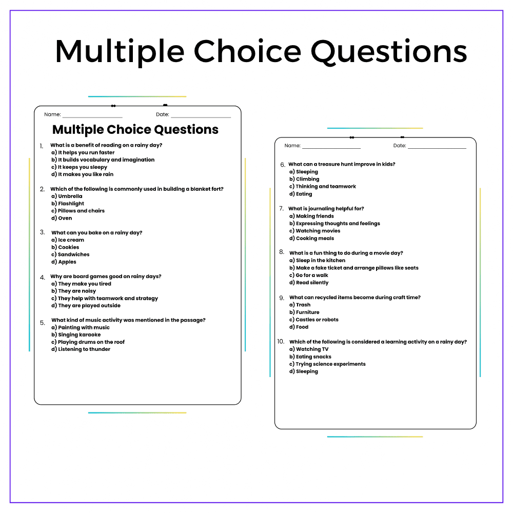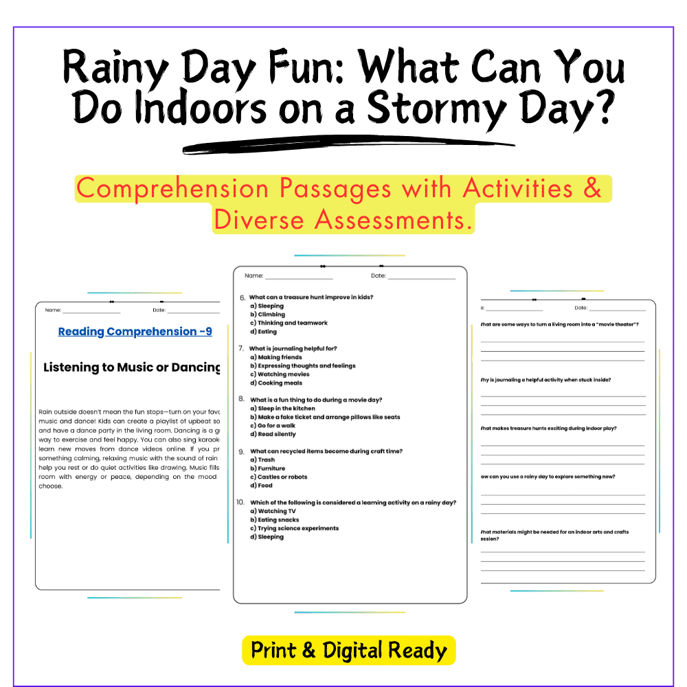 This worksheet helps your students turn stormy days into learning opportunities with this interactive Rainy Day Fun: What Can You Do Indoors on a Stormy Day? worksheet! Designed for grades 4–8, this resource encourages creativity and problem-solving while exploring safe, fun, and educational activities to do during rainy weather.