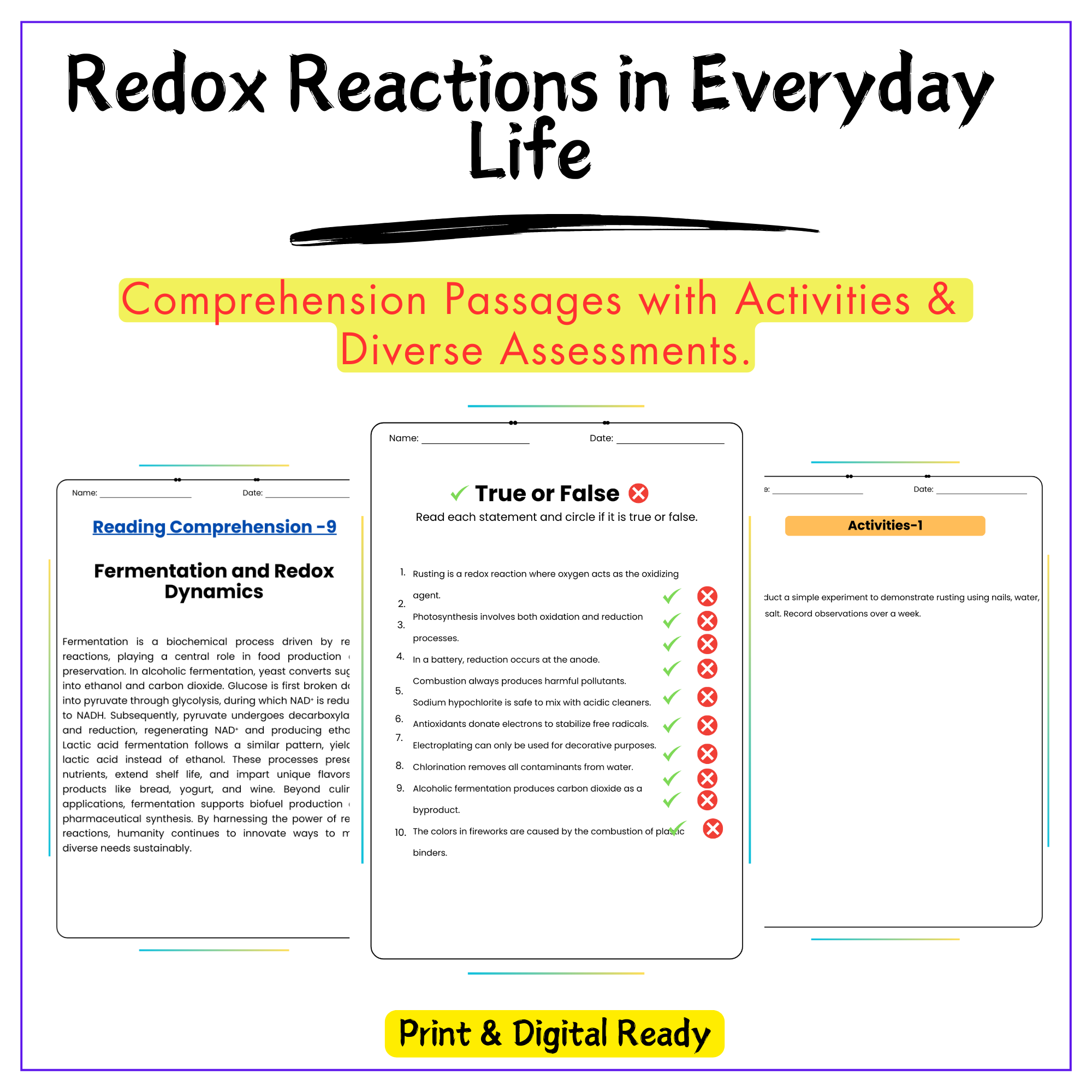This versatile worksheet is perfect for individual assignments, group discussions, homeschooling, or extra practice, helping students understand how redox processes shape the world around them. With a mix of comprehension passages, fill-in-the-blanks, multiple-choice questions (MCQs), true/false exercises, and problem-solving challenges, students stay engaged while reinforcing key concepts. The included class activities bring redox chemistry to life through hands-on exploration.