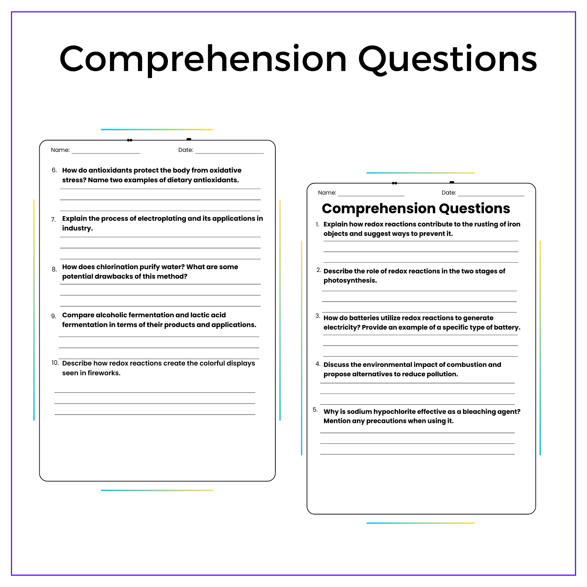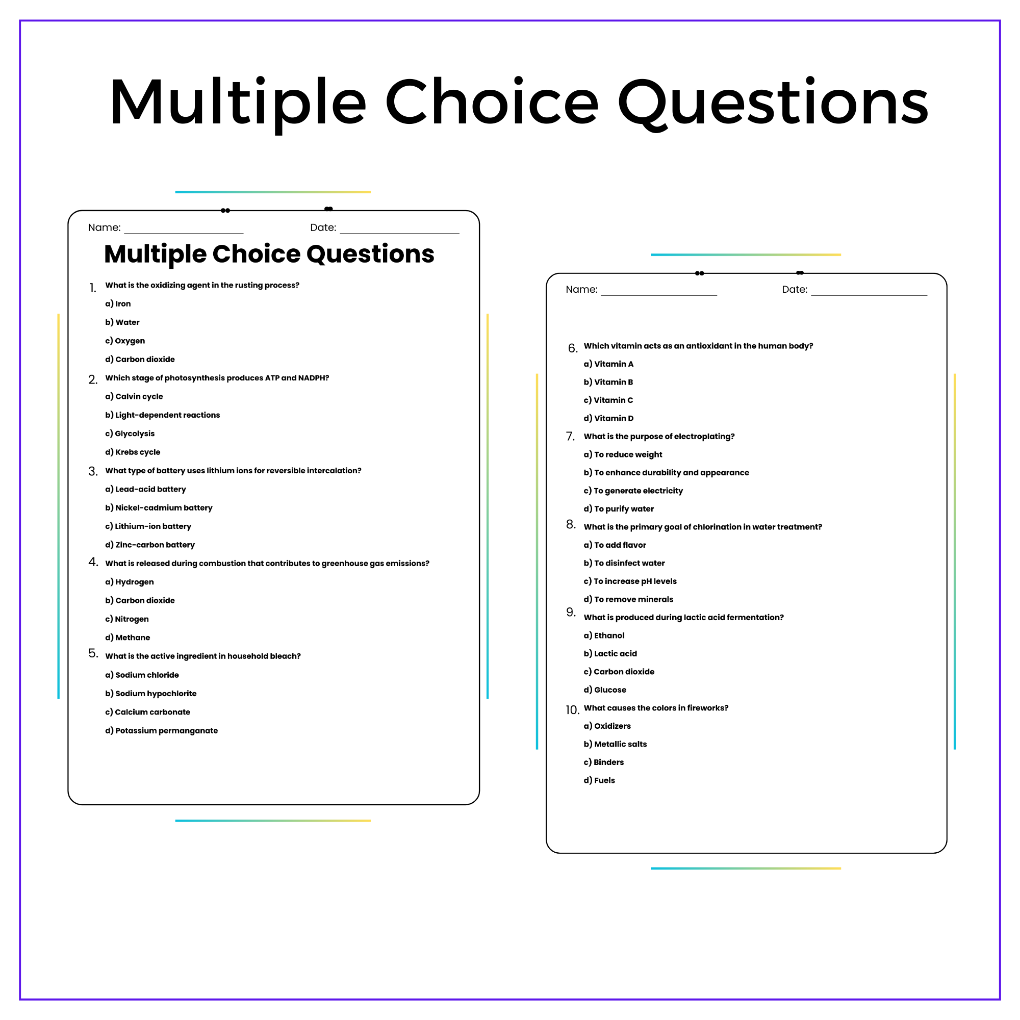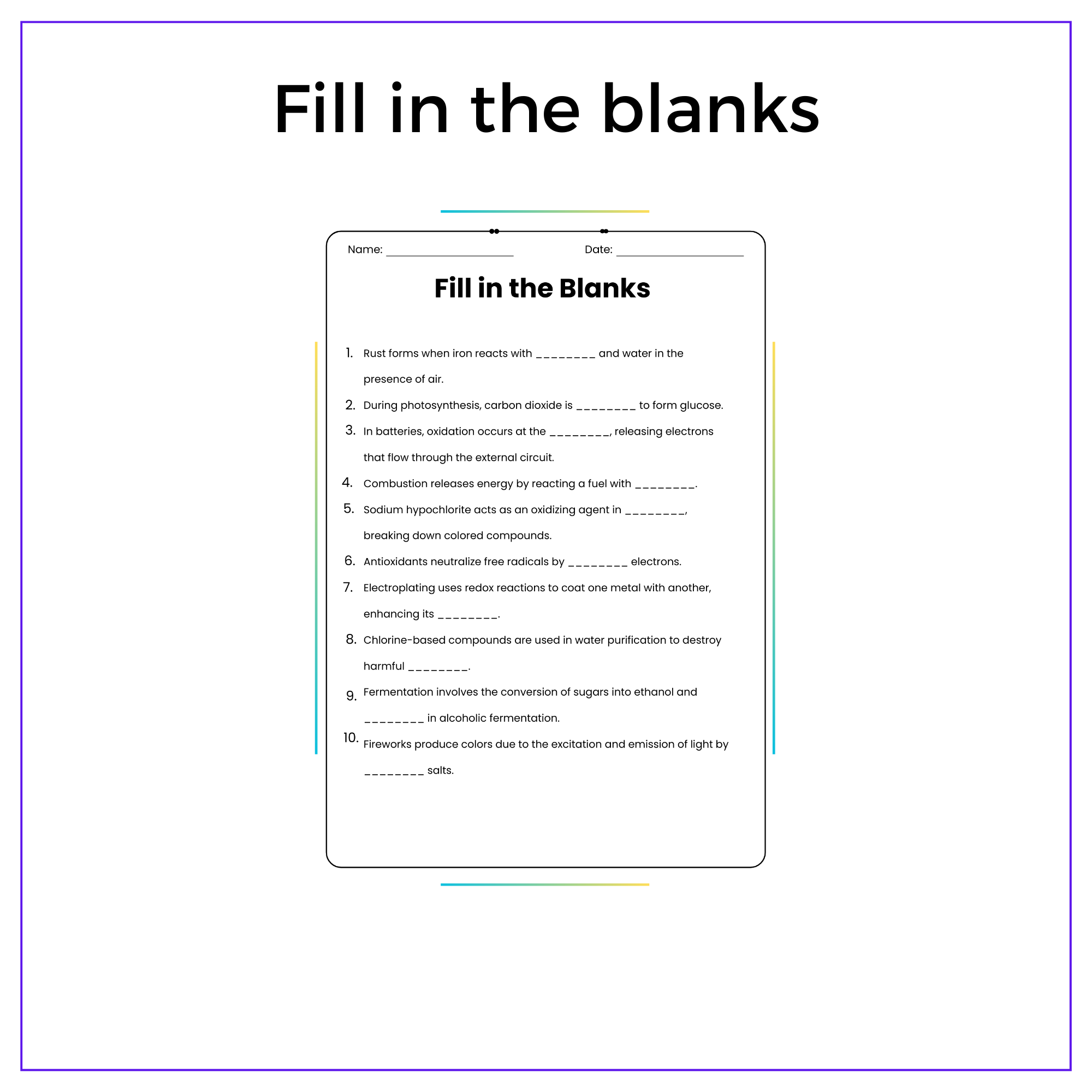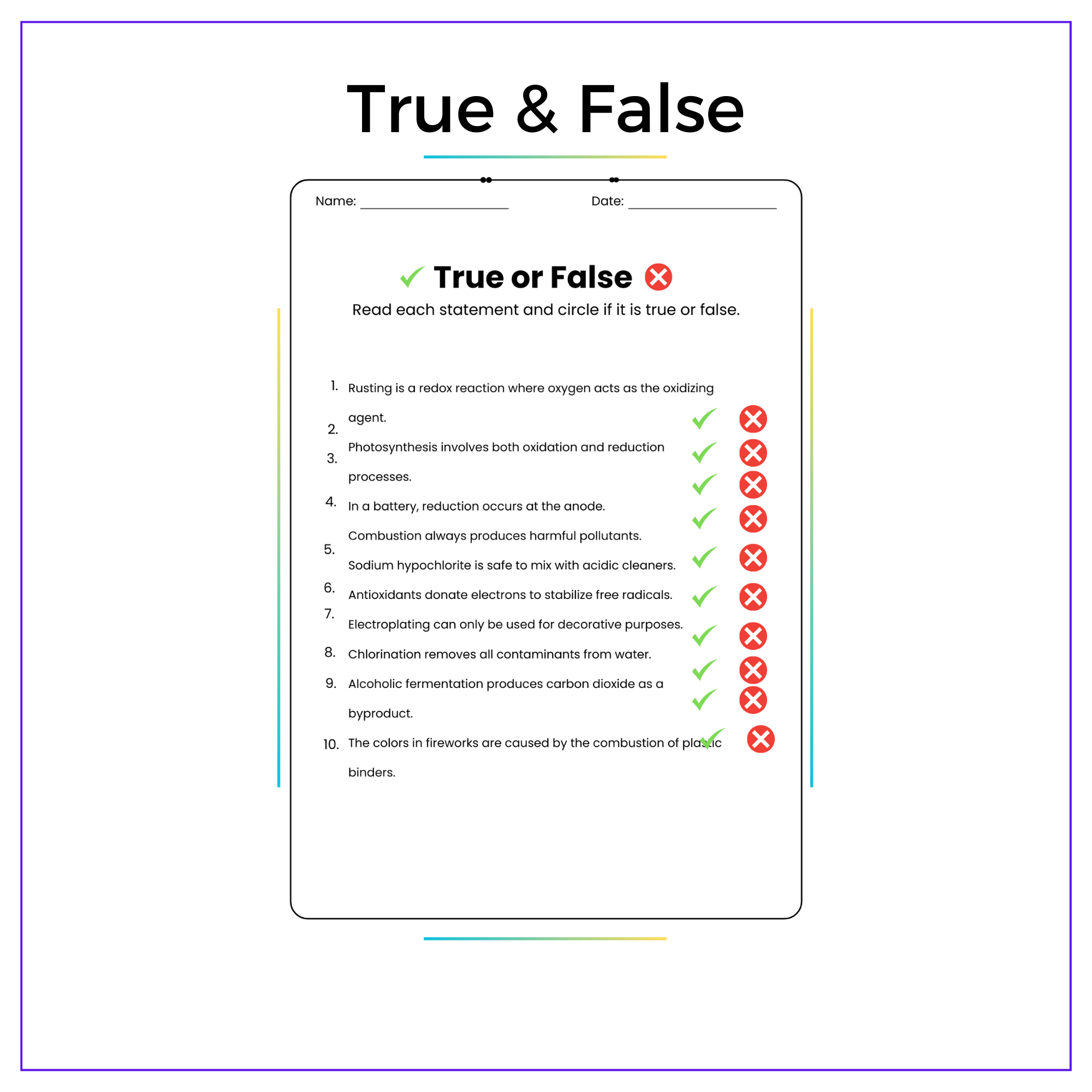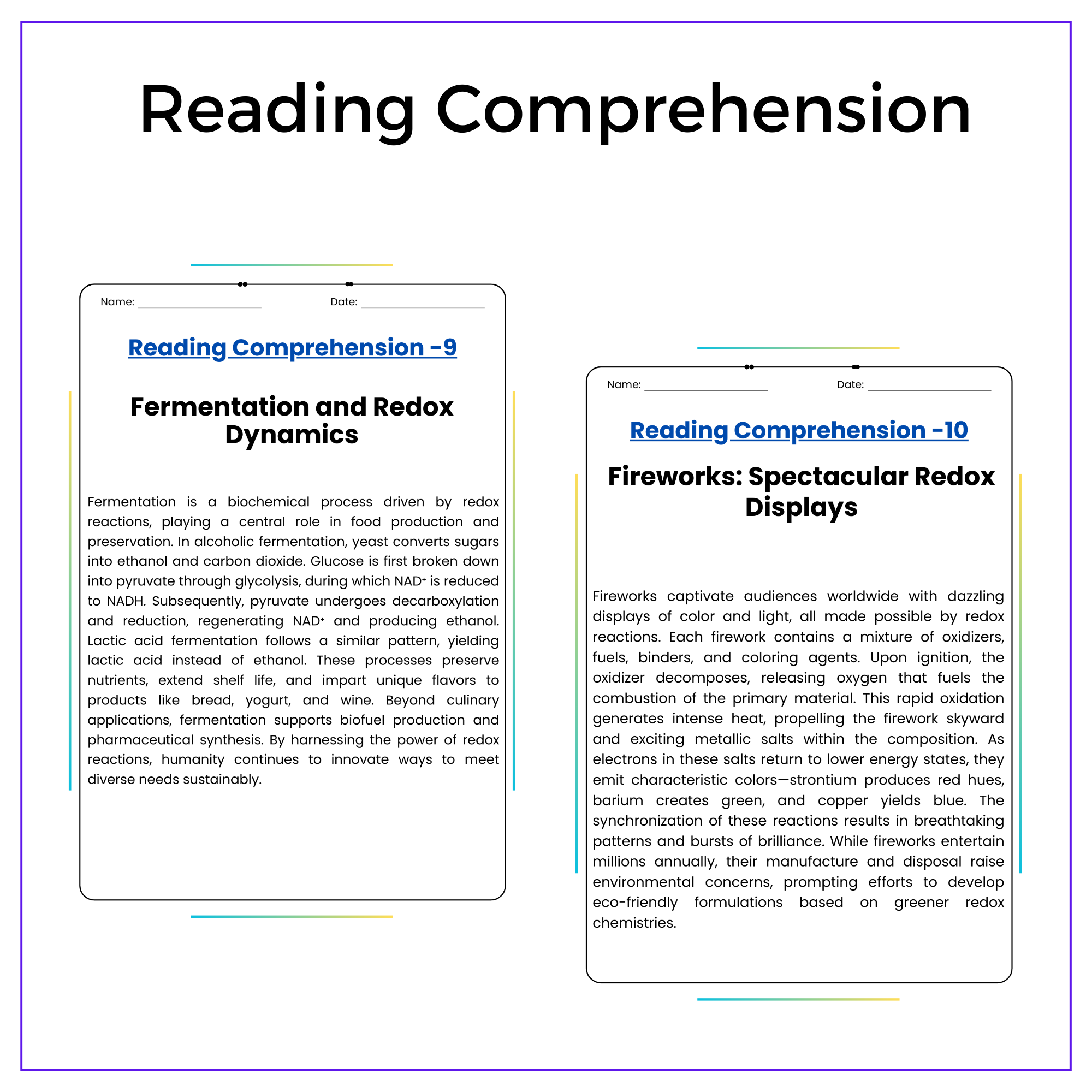 This versatile worksheet is perfect for individual assignments, group discussions, homeschooling, or extra practice, helping students understand how redox processes shape the world around them. With a mix of comprehension passages, fill-in-the-blanks, multiple-choice questions (MCQs), true/false exercises, and problem-solving challenges, students stay engaged while reinforcing key concepts. The included class activities bring redox chemistry to life through hands-on exploration.