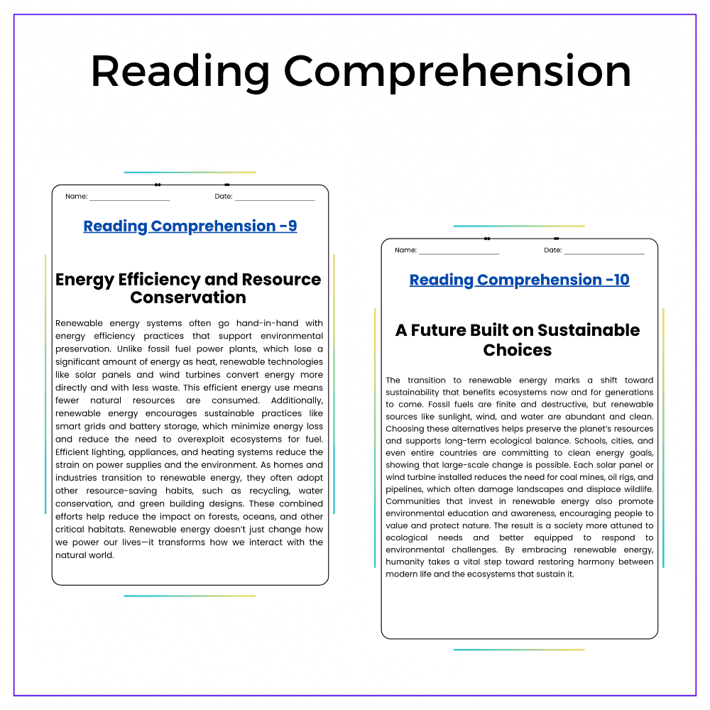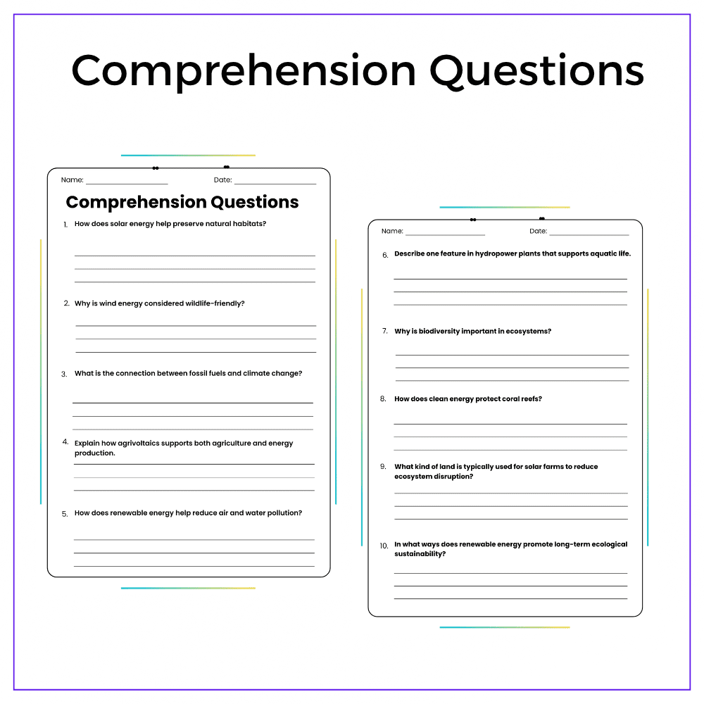 - Comprehension passages – Break down types of renewable energy and their benefits