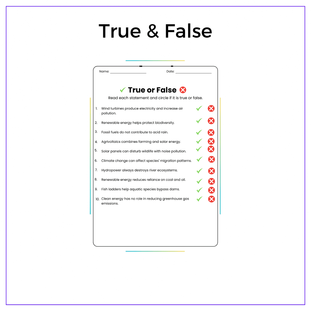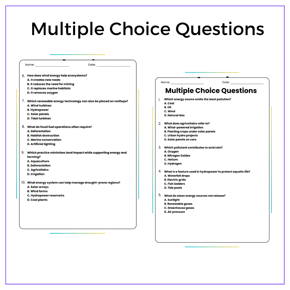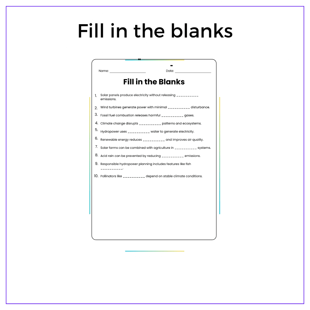 This worksheet helps your students explore clean energy solutions with this interactive Renewable Energy and Ecosystem Preservation worksheet! Designed for grades 4–8, this resource teaches how solar, wind, and hydro power reduce pollution, protect habitats, and help ecosystems thrive.