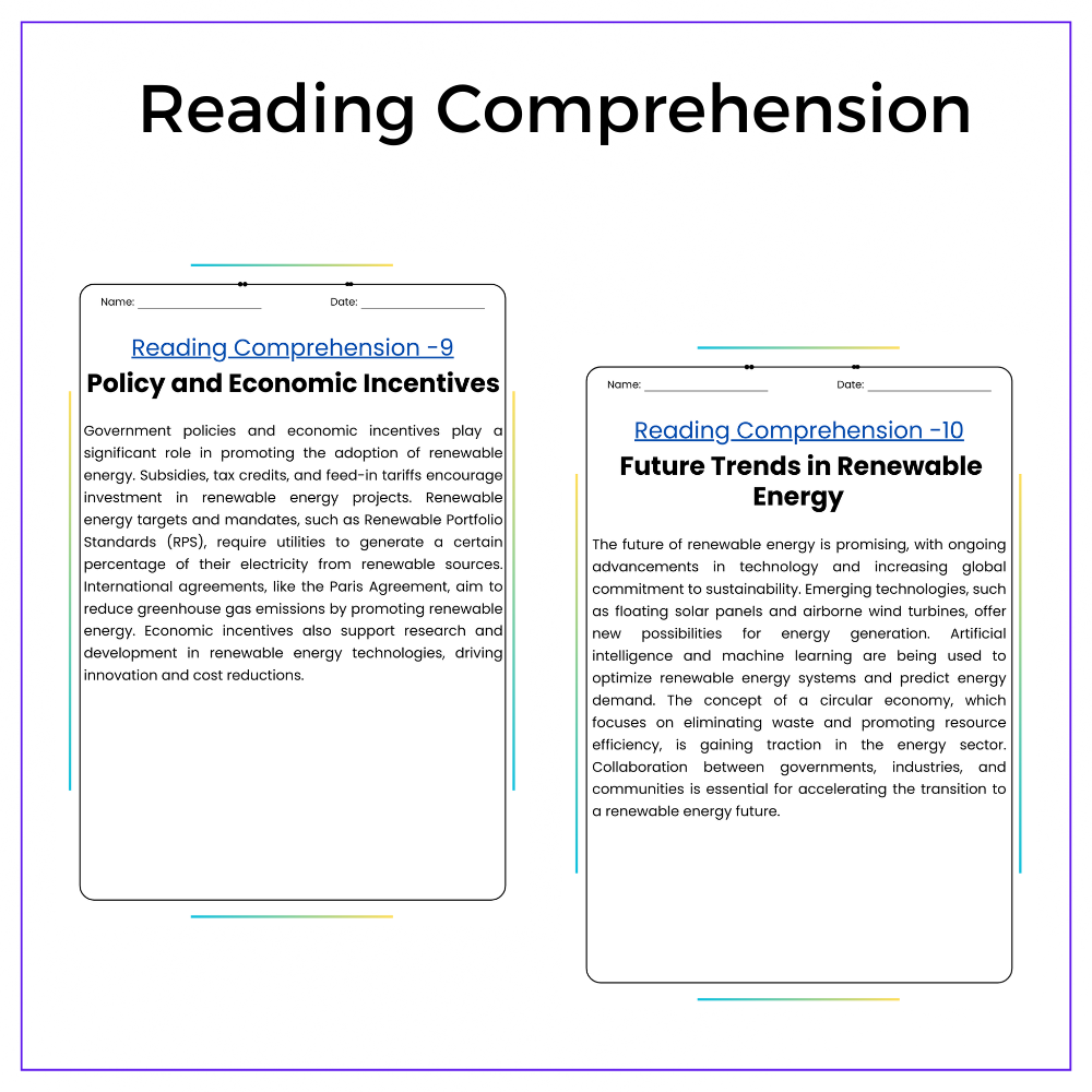 • Comprehension passages – Explore the science and future of clean energy sources