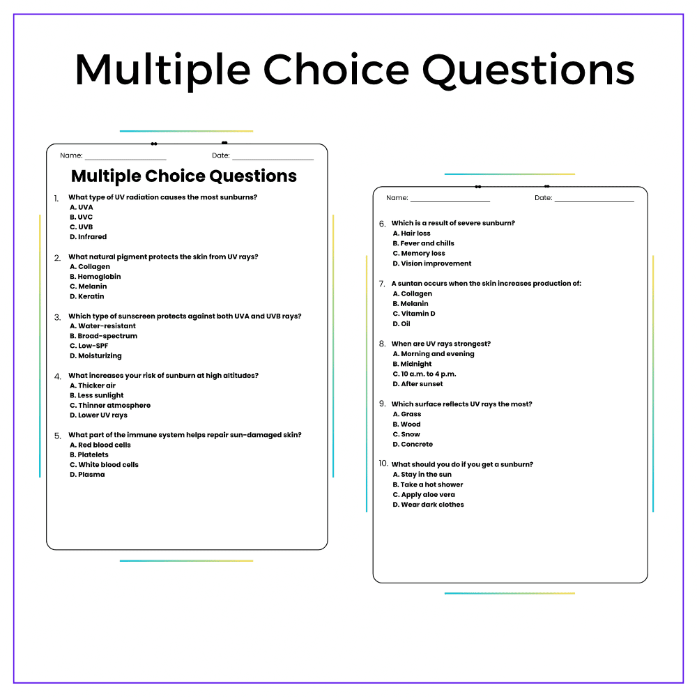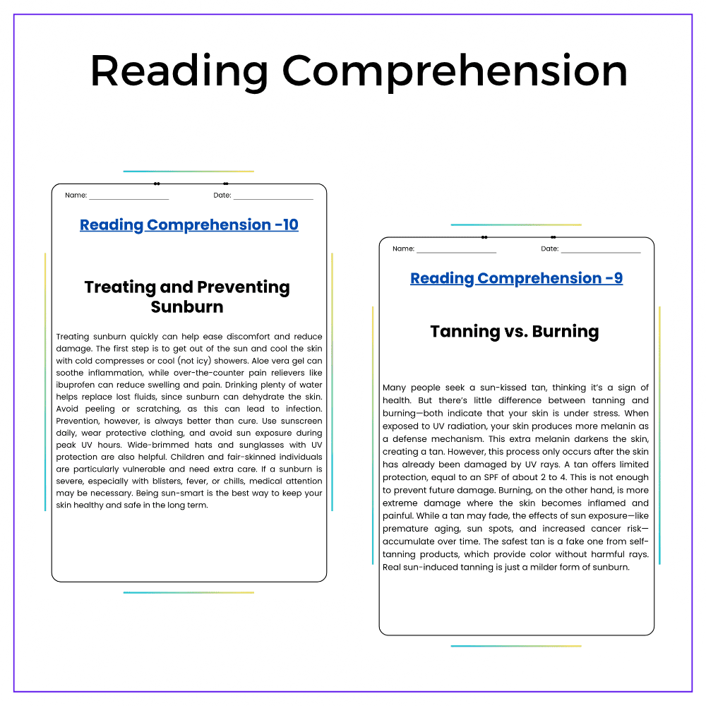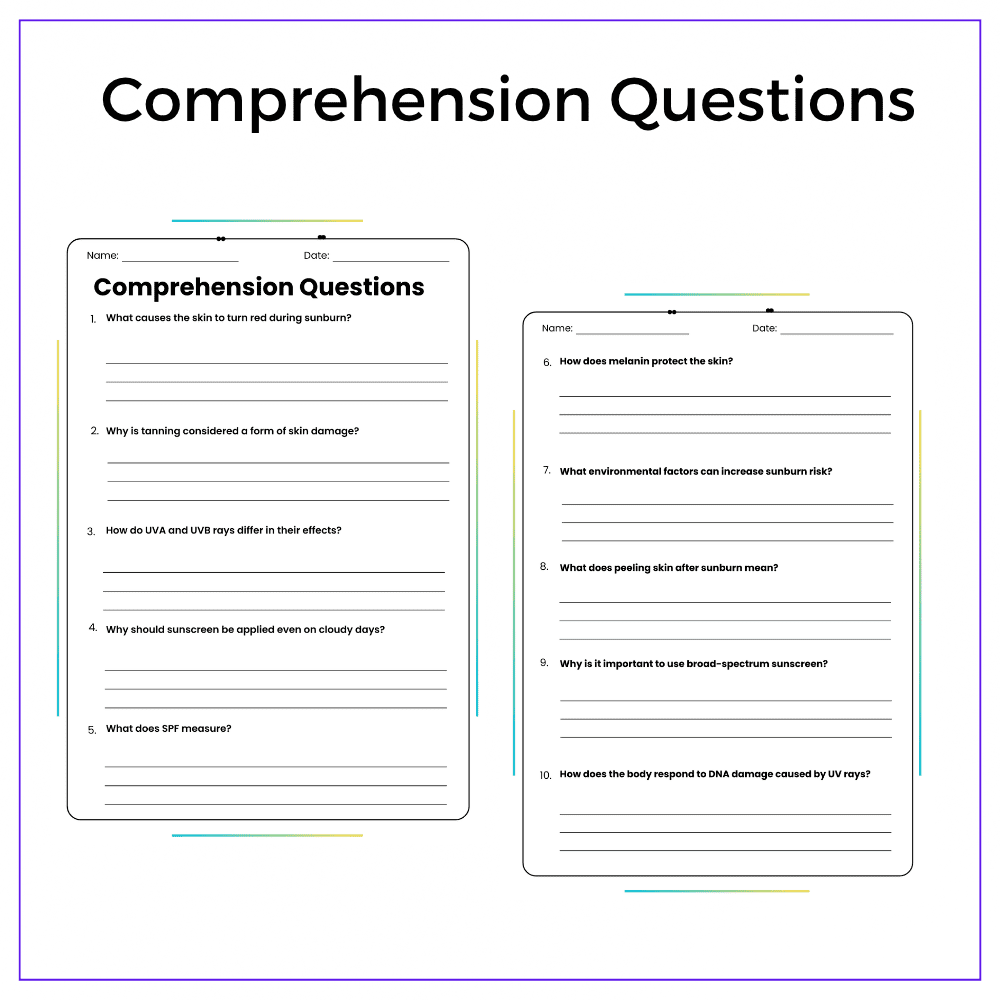 - Comprehension passages – Describe UV rays, melanin, and skin response
