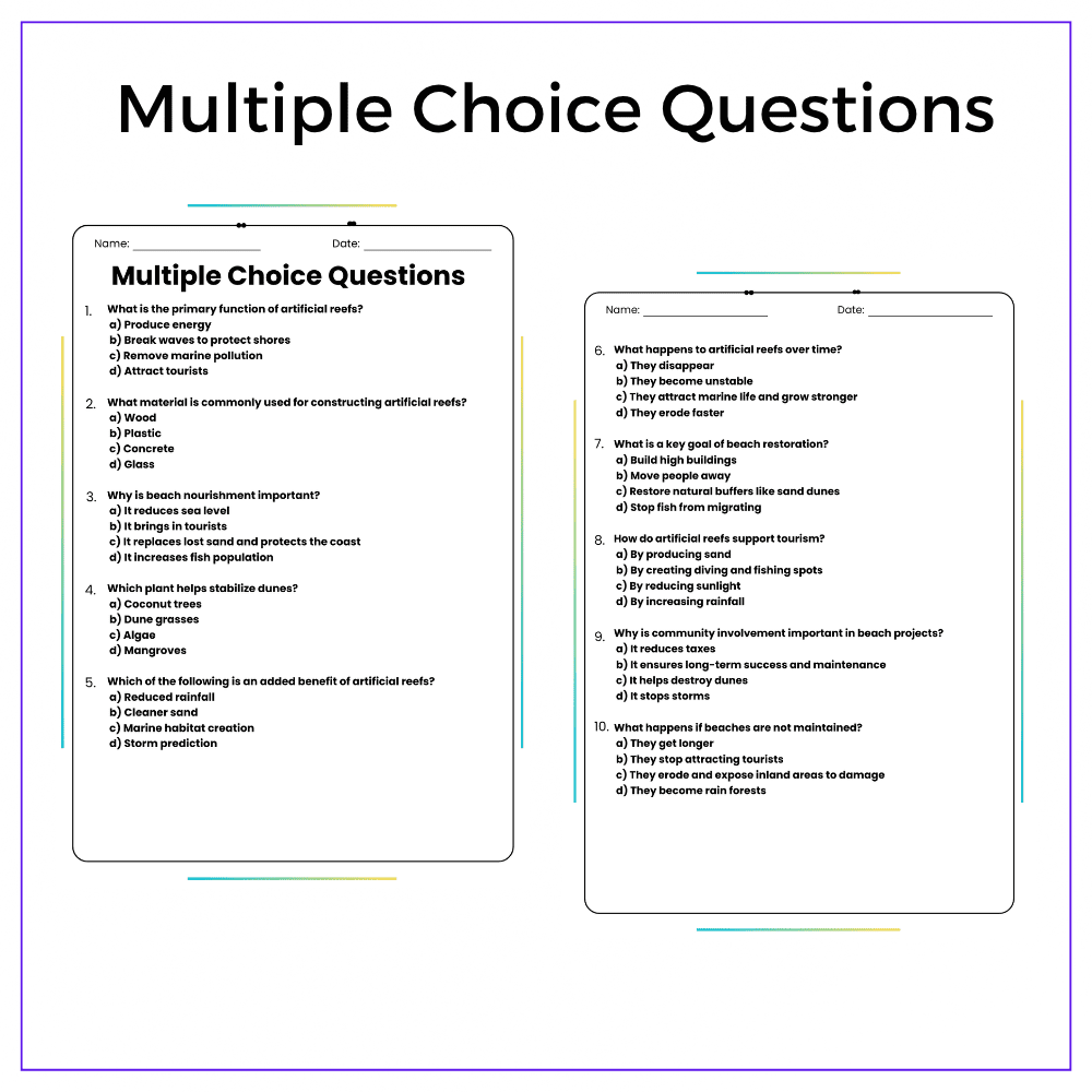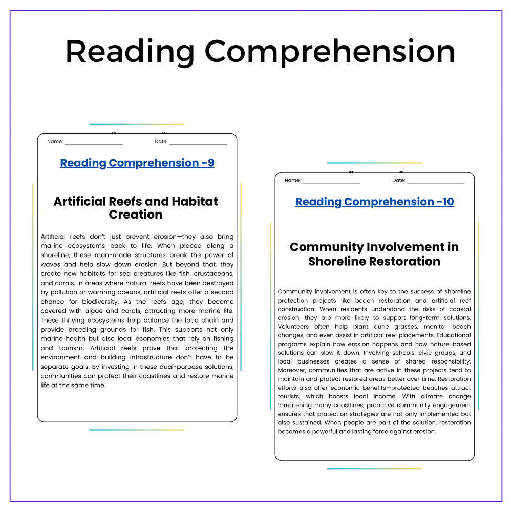 ✅ Comprehension passages – Explain artificial reefs, beach nourishment, and coastal protection methods