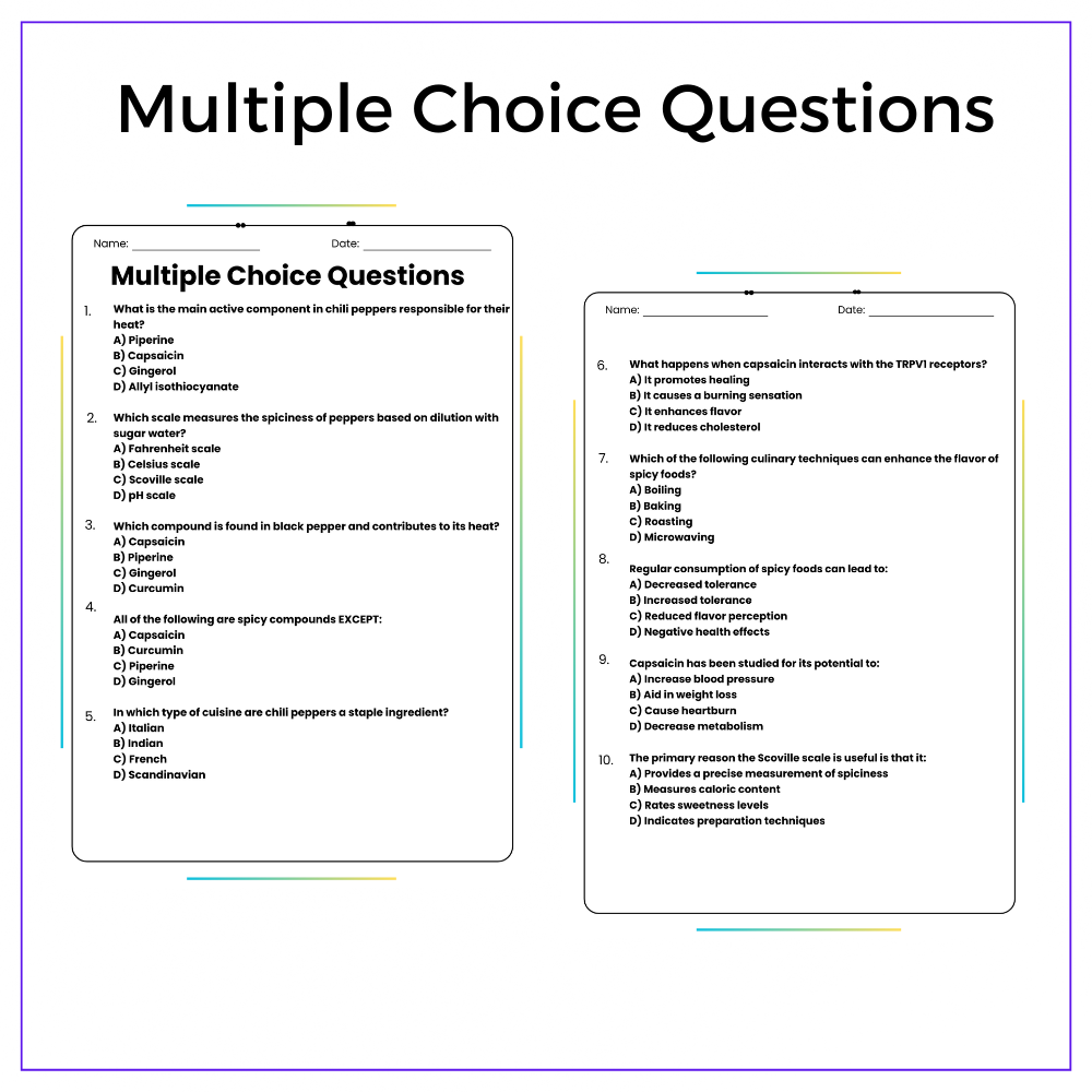 This versatile worksheet is perfect for individual assignments, group discussions, homeschooling, or extra practice. Using clear explanations, fill-in-the-blanks, multiple-choice questions (MCQs), true/false exercises, and problem-solving challenges, students will explore chemical reactions and sensory biology. Fun class activities turn curiosity about spicy snacks into scientific discovery!