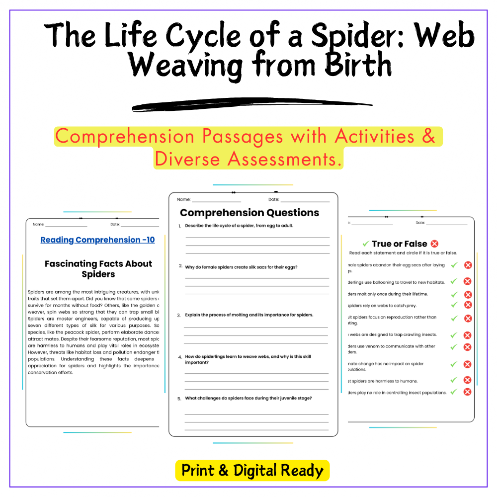 This versatile worksheet is perfect for individual assignments, group discussions, homeschooling, or extra practice, ensuring every student builds a clear understanding of arachnid development. With a mix of comprehension passages, fill-in-the-blanks, multiple-choice questions (MCQs), true/false exercises, and problem-solving challenges, learners stay engaged while mastering key concepts. The included class activities bring spiders to life in your classroom!