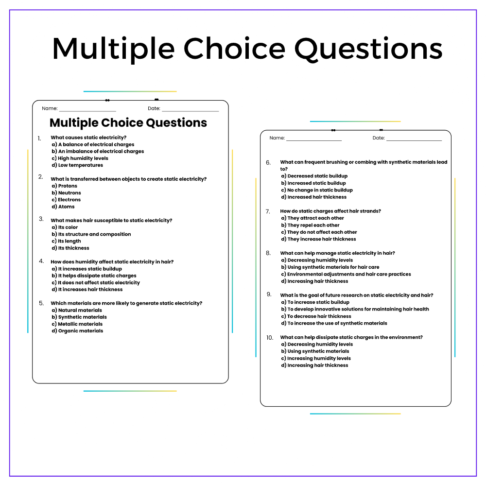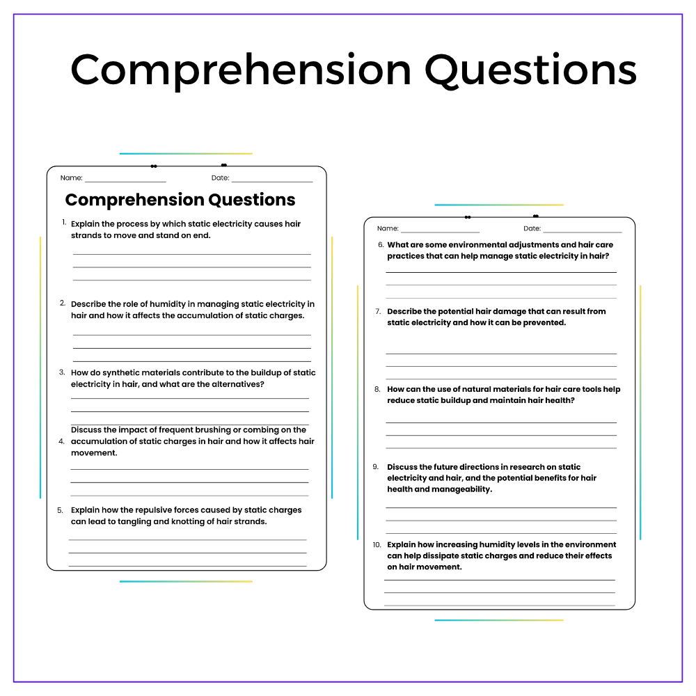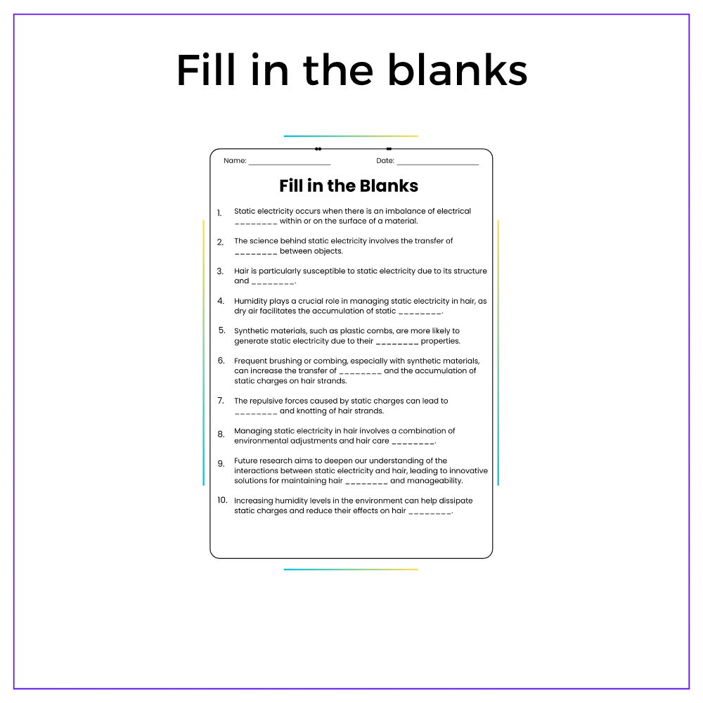 This worksheet helps your students uncover the invisible force of static electricity with this interactive Role of Static Electricity in Hair Movement worksheet! Designed for grades 4–8, this resource explains how static charges build up and affect objects, especially why your hair stands on end.
