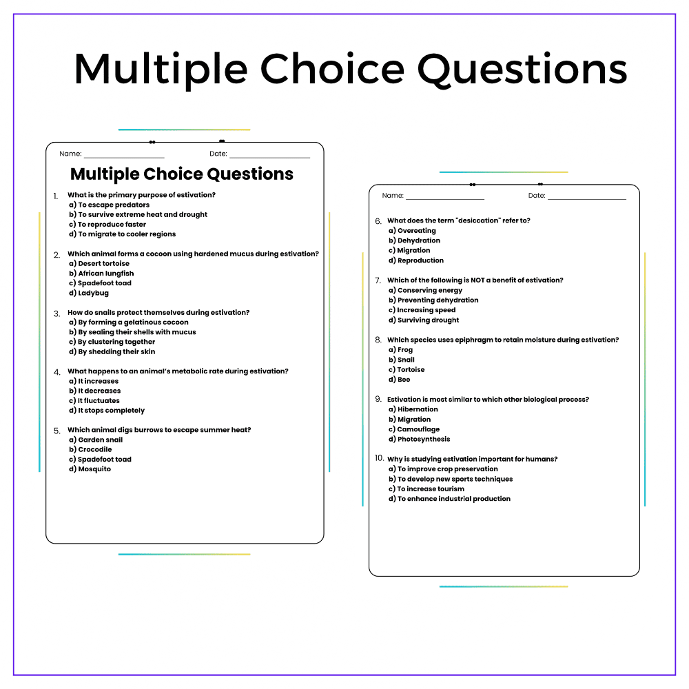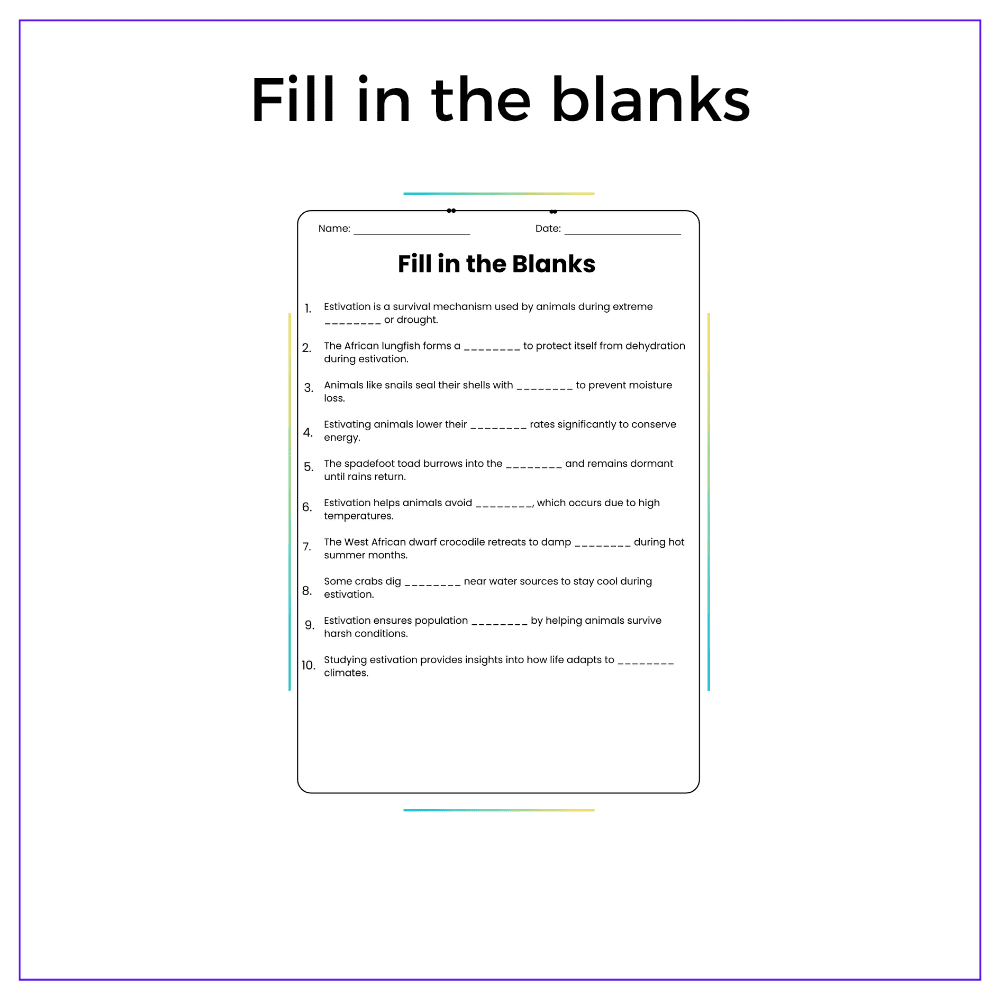 This versatile worksheet is perfect for individual assignments, group discussions, homeschooling, or extra practice, helping students compare estivation and hibernation in various climates. Through interactive elements, learners will explore how creatures adapt when water and shade are scarce.
