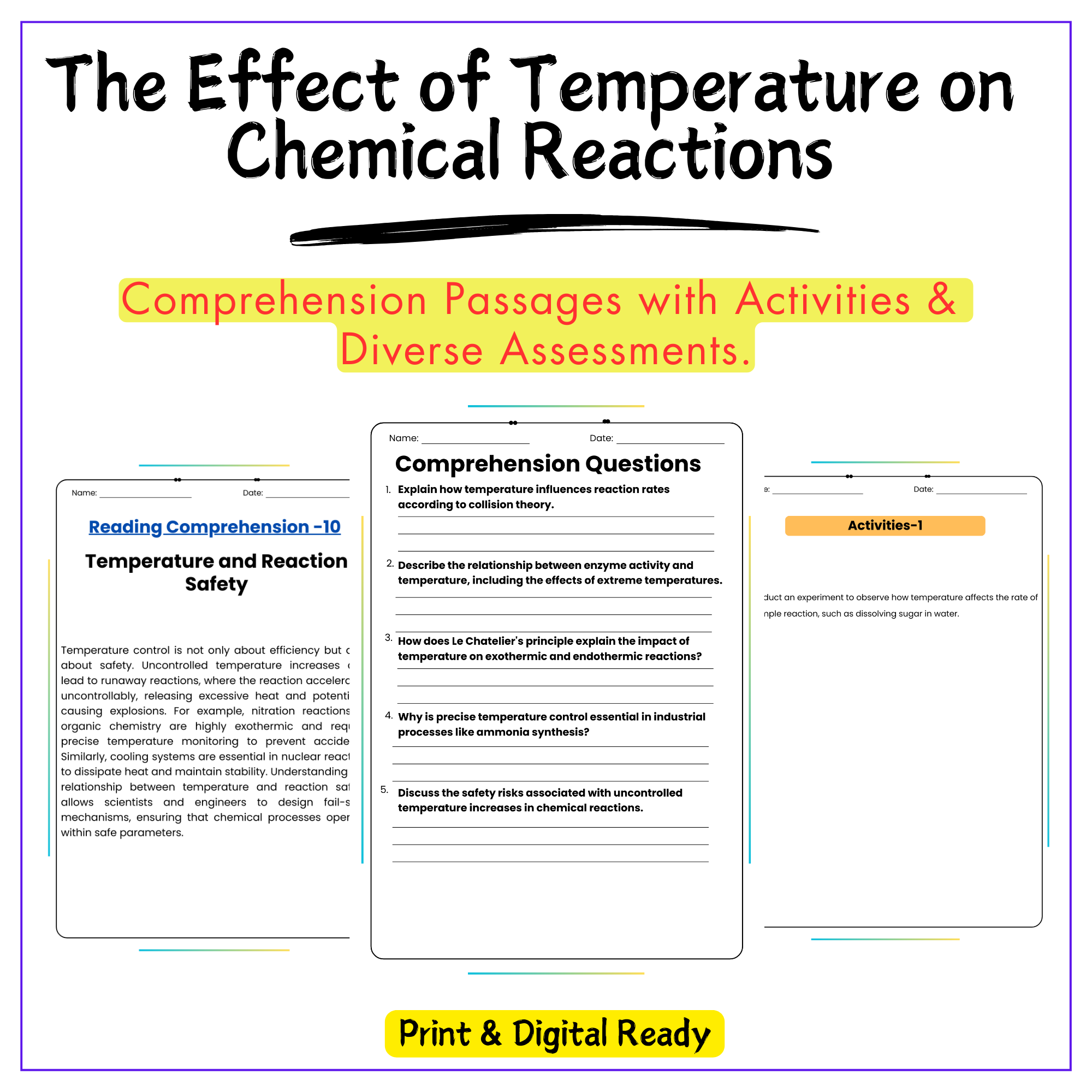 This versatile worksheet is perfect for individual assignments, group discussions, homeschooling, or extra practice, ensuring students gain a deeper understanding of reaction rates. With a mix of comprehension passages, fill-in-the-blanks, multiple-choice questions (MCQs), true/false exercises, and problem-solving challenges, students stay actively engaged. The included class activities provide hands-on experiments and real-world connections.