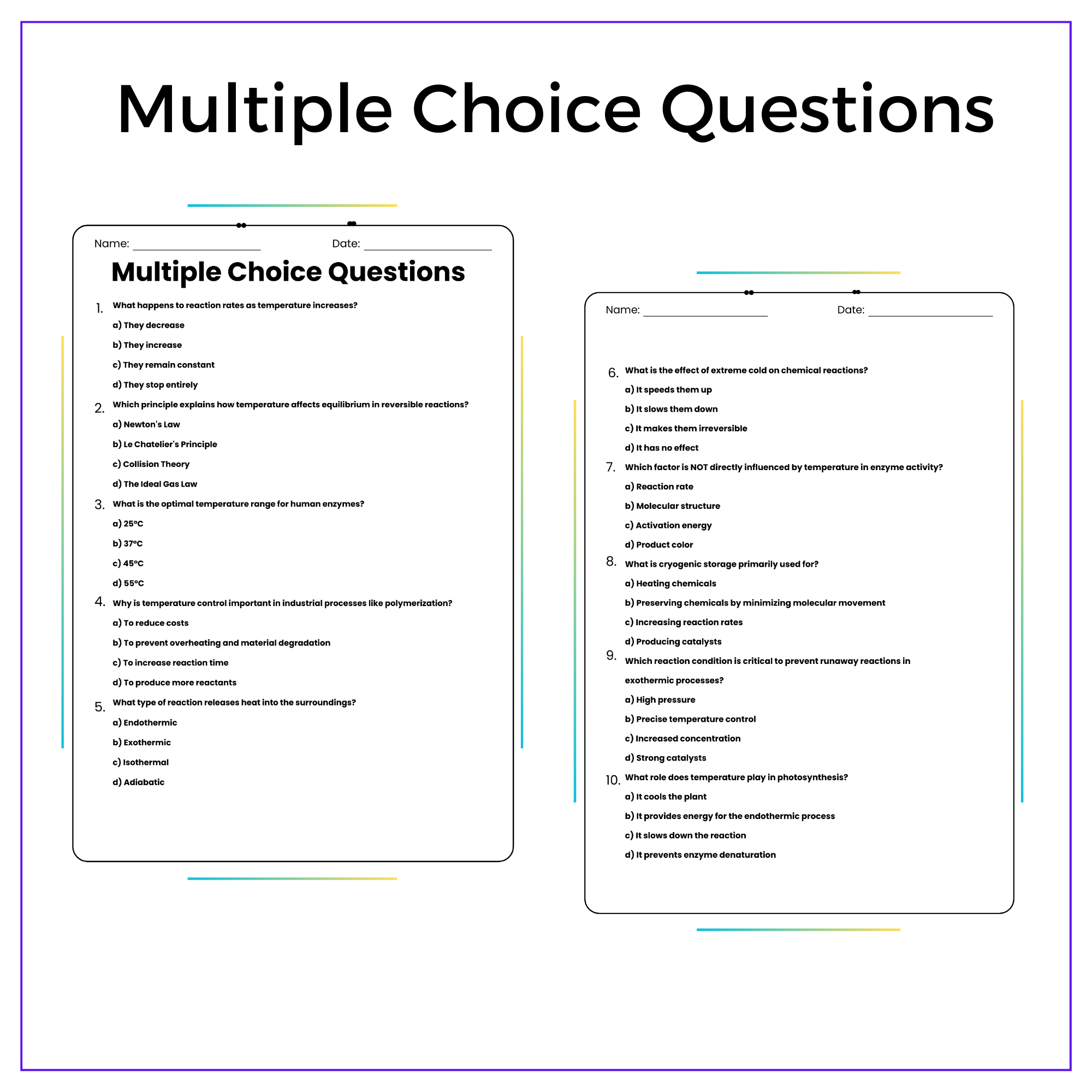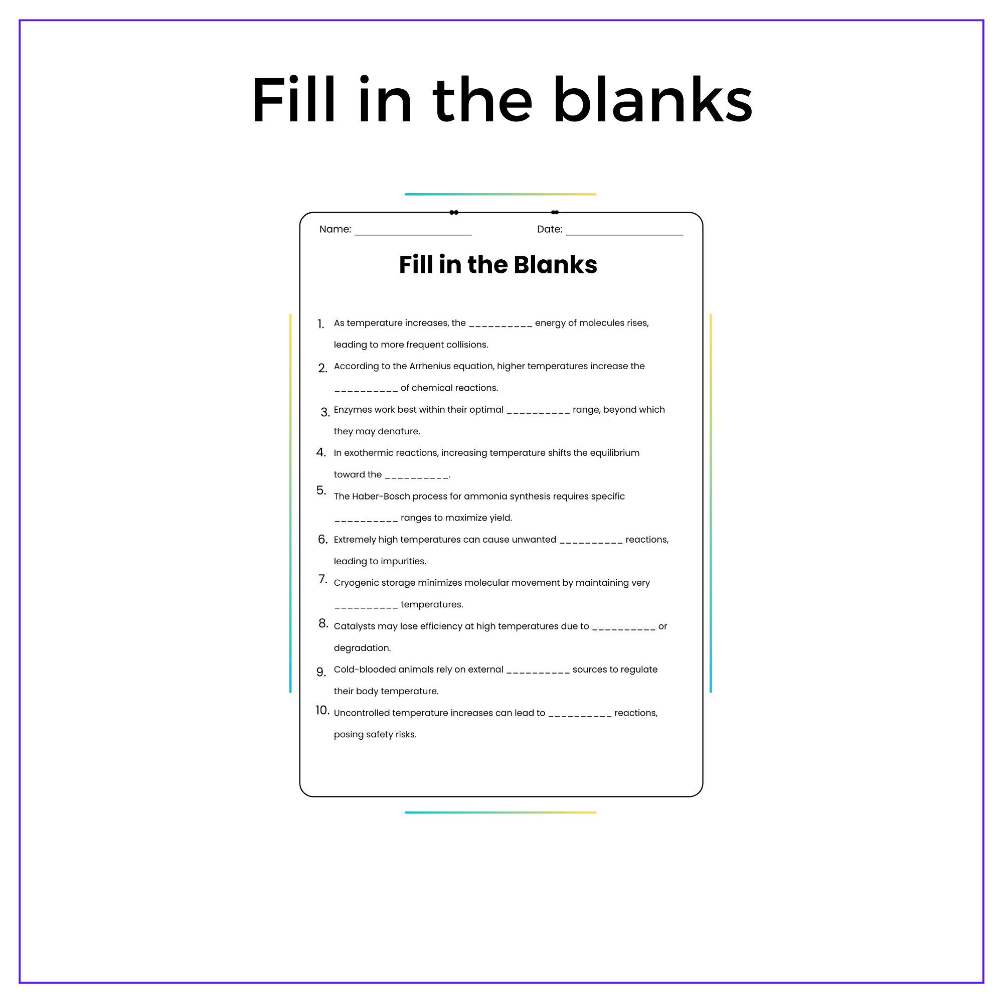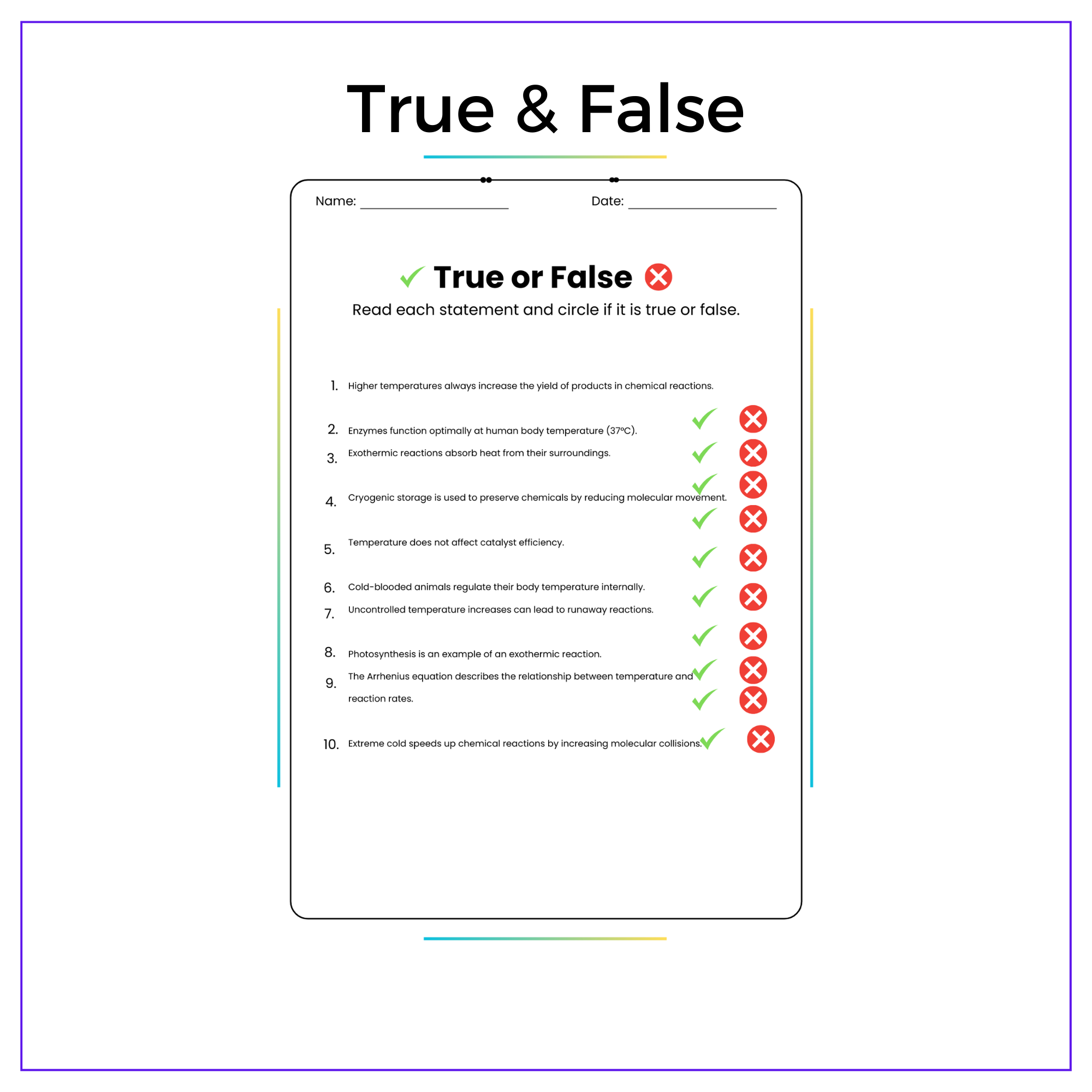 This worksheet helps your students explore how temperature affects chemical reactions with this interactive Effect of Temperature on Chemical Reactions worksheet! Designed for grades 4-8, this resource demonstrates how heating or cooling can speed up or slow down reactions using everyday examples.