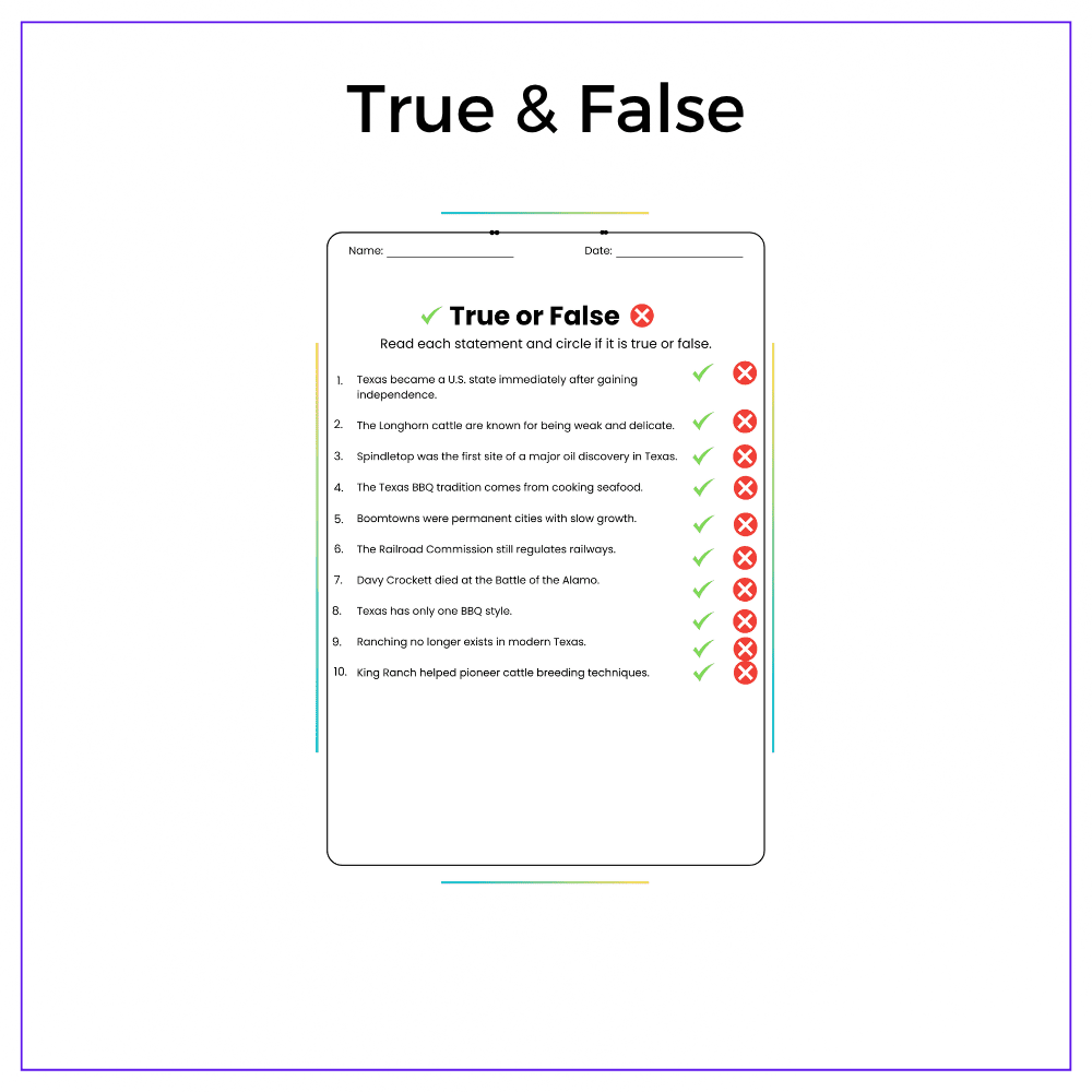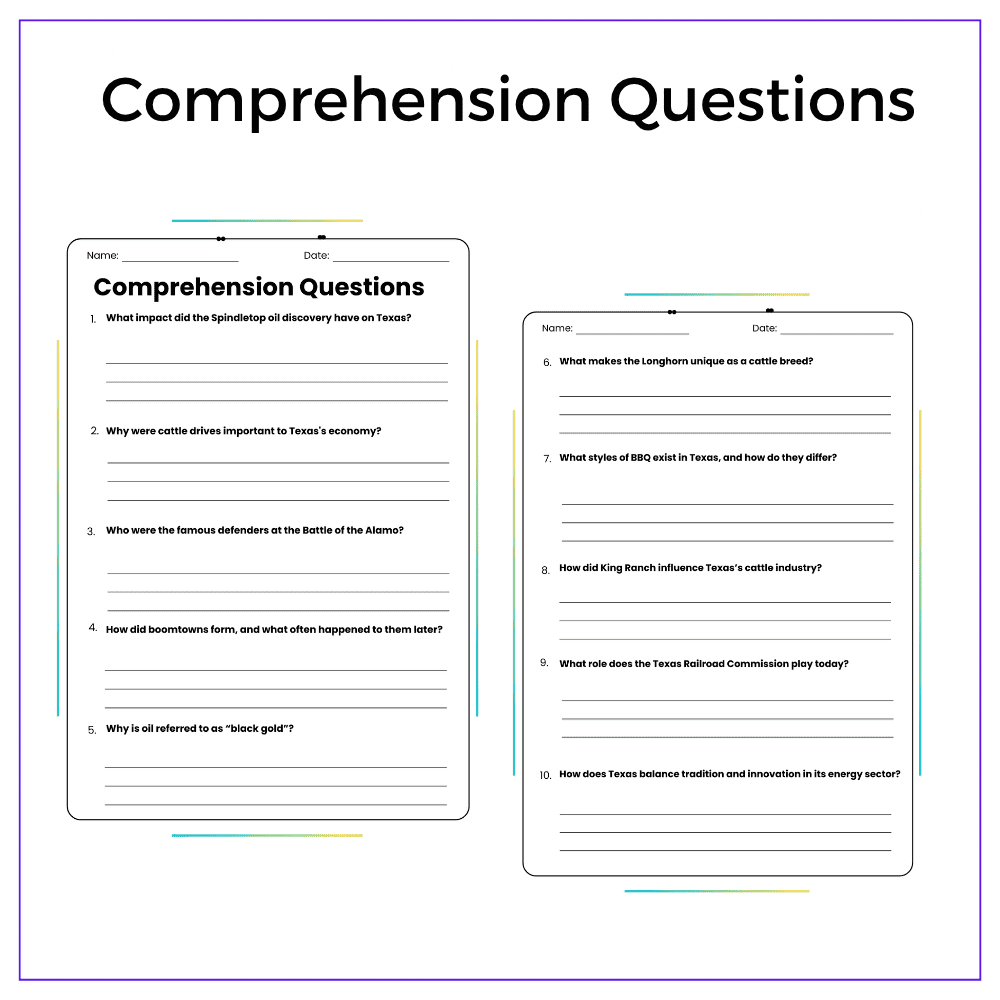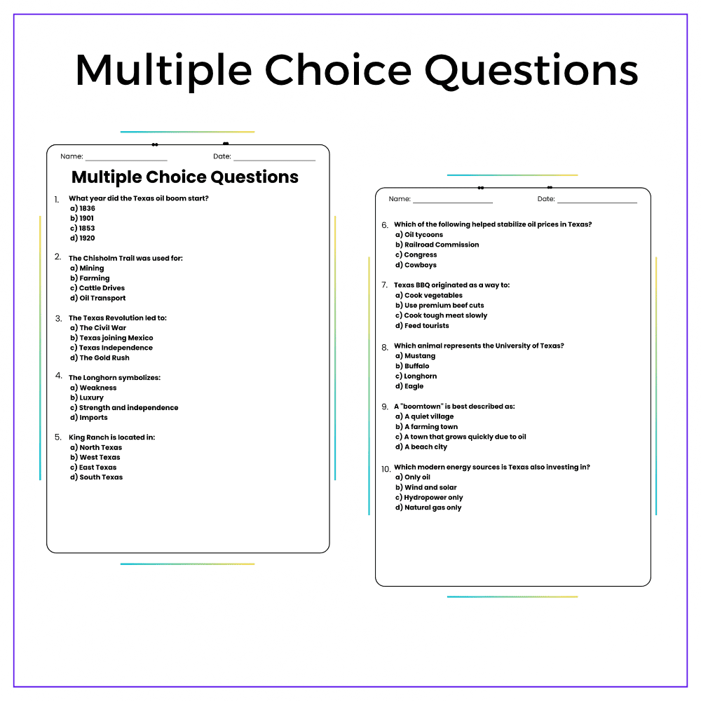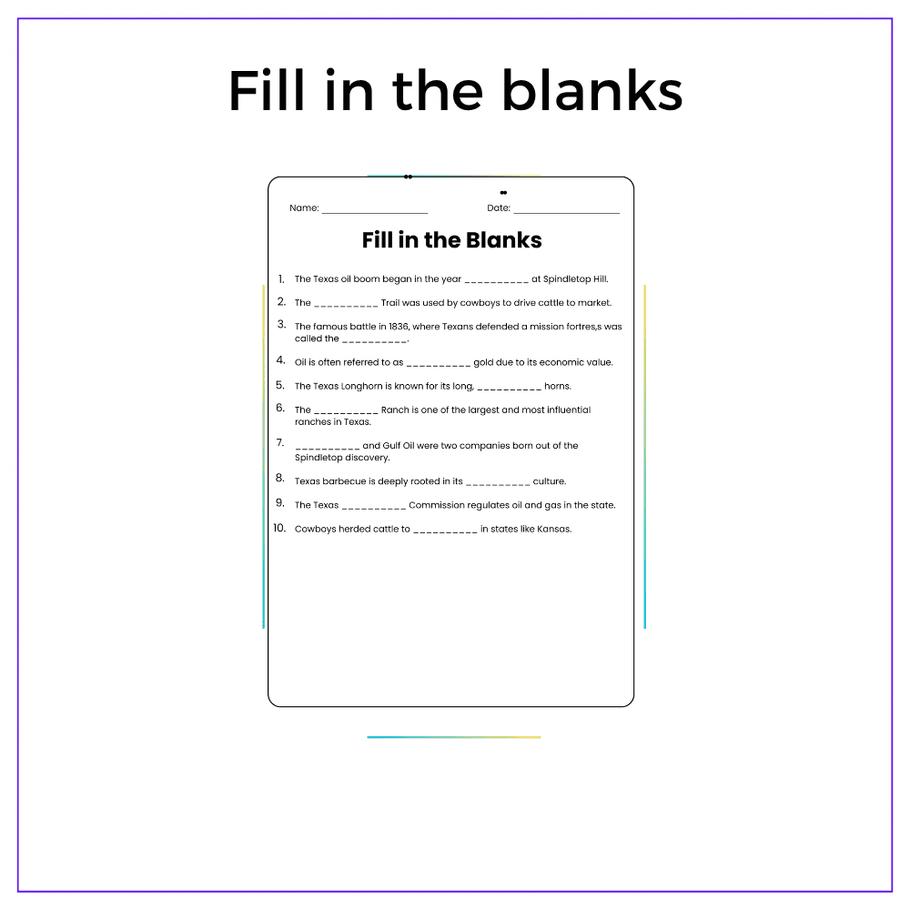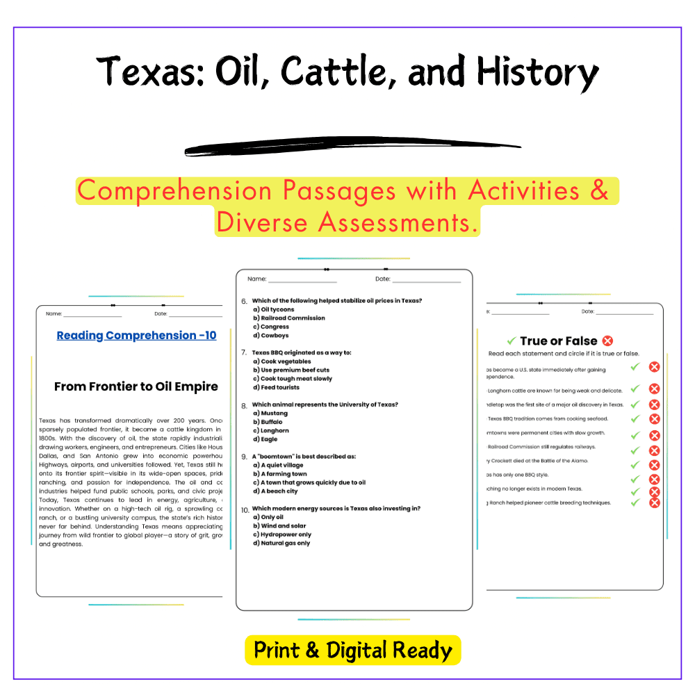 This worksheet helps your students explore the Lone Star State with this interactive Texas: Oil, Cattle, and History worksheet! Designed for grades 4–8, this resource introduces students to Texas’s rich history, its vital oil and cattle industries, and key cultural icons like the Alamo and cowboy heritage.