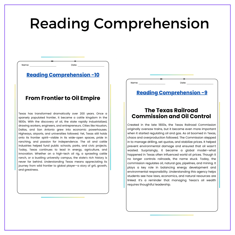 - Comprehension passages – Learn about Texas’s past, industries, and landscape